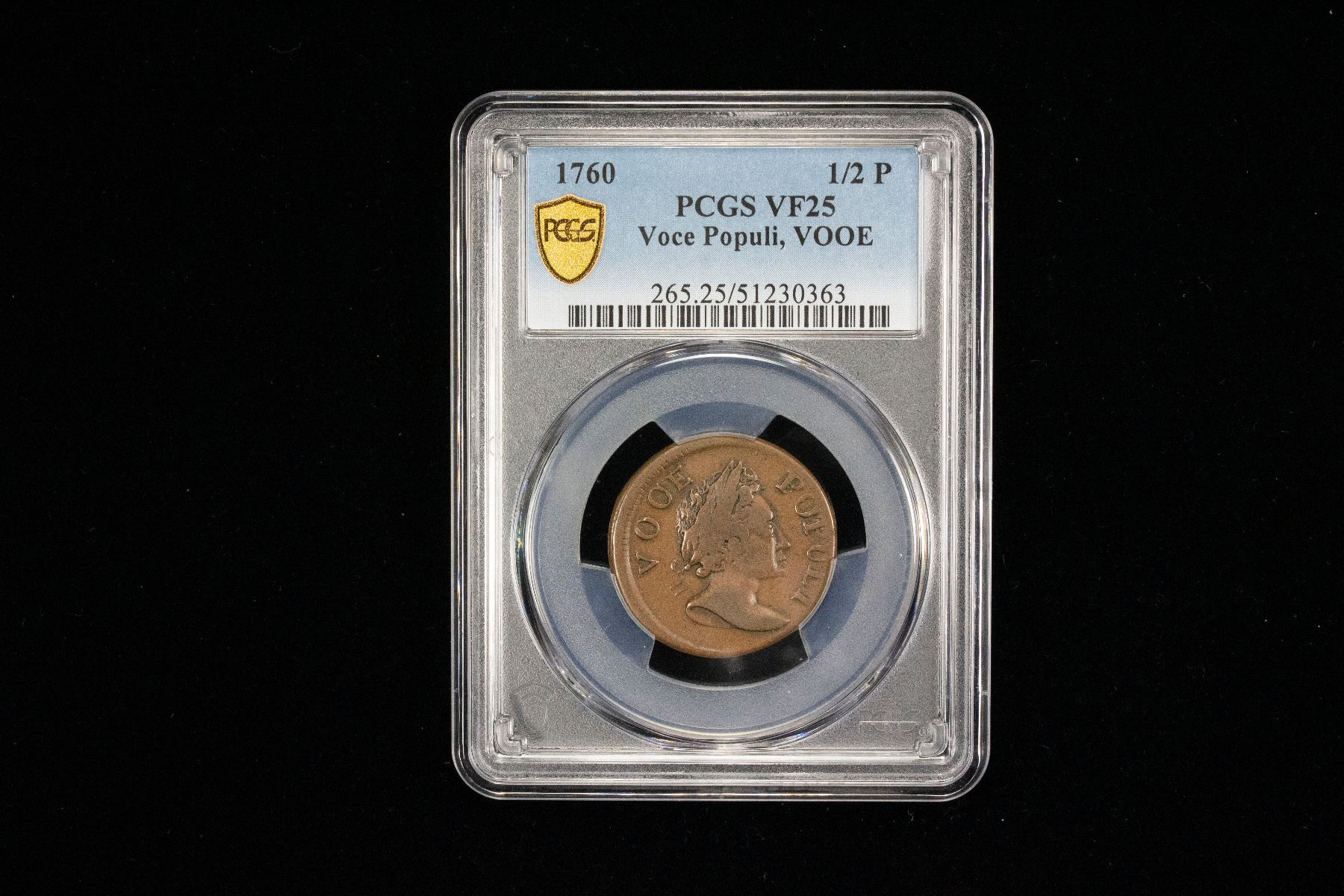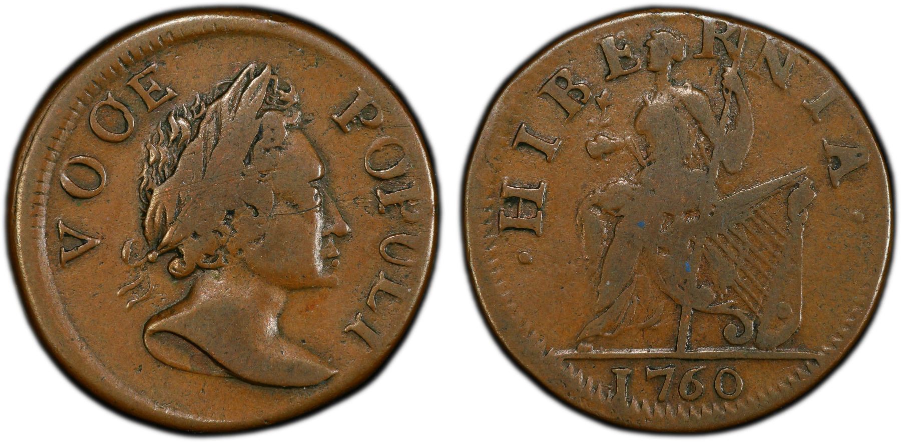 UNITED STATES: AE halfpenny, 1760, KM-Tn1, Voce Populi copper, VOOE variety, PCGS graded VF25. By 1760 small coppers were scarce in Ireland. No royal Irish farthings had been issued since 1744 and no royal Irish halfpence since 1755. Issues of both denominations were scheduled to be minted in 1760 but apparently they did not arrive in Ireland until 1762. It has been speculated this was partly due to the death of George II in October of 1760. Under these circumstances underweight Voce Populi farthings and halfpence first appeared in Dublin. Very little is known about the origins of these coins, all of which carry the date 1760. Traditionally they have been attributed to a man named Roche who was a button maker on South King Street in Dublin. It is thought these coppers may have continued to be produced through 1761 using the 1760 dated dies. It is generally assumed their production ceased by 1762 when the regal 1760 coppers finally arrived. The Voce populi series saw limited use in the American Colonies.