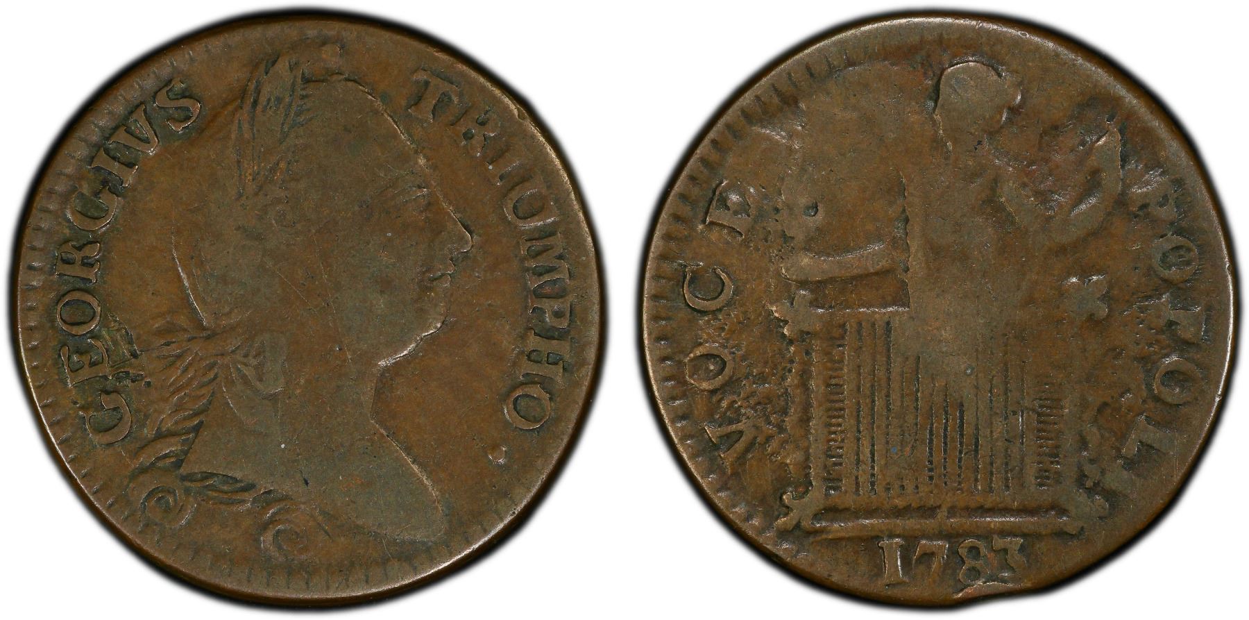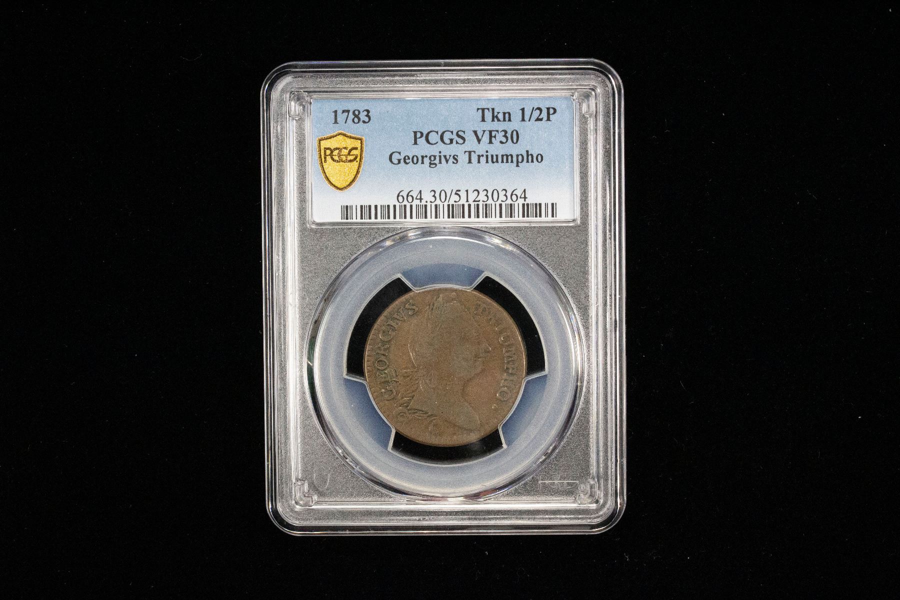 UNITED STATES: AE halfpenny, 1783, KM-Tn35, Georgius Triumpho copper, PCGS graded VF30. One of the first George Washington tokens was the Georgius Triumpho token dated 1783. These tokens were struck for use in America as the fledgling American government had not yet created a US Mint to solve their coin shortage problem. Most of this series of tokens were made in England and they have been attributed to a few makers in Birmingham. They were then shipped to America for use as temporary coinage or as a tribute to General (and later President) George Washington. These Georgius Triumpho tokens are the only tokens that we actually know did circulate in the Colonies at that time. A number of these tokens were over-struck with the dies of other colonial copper coins.