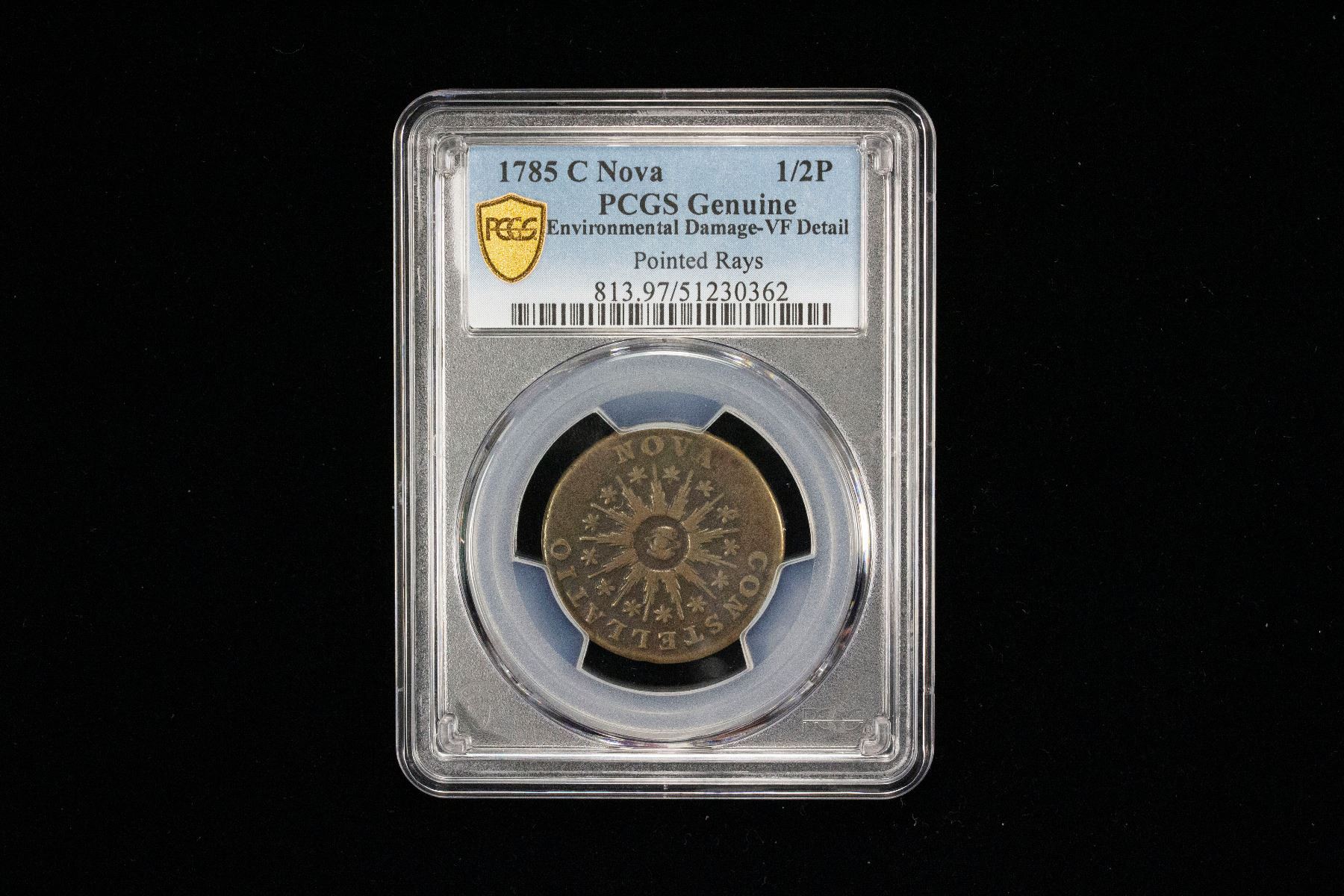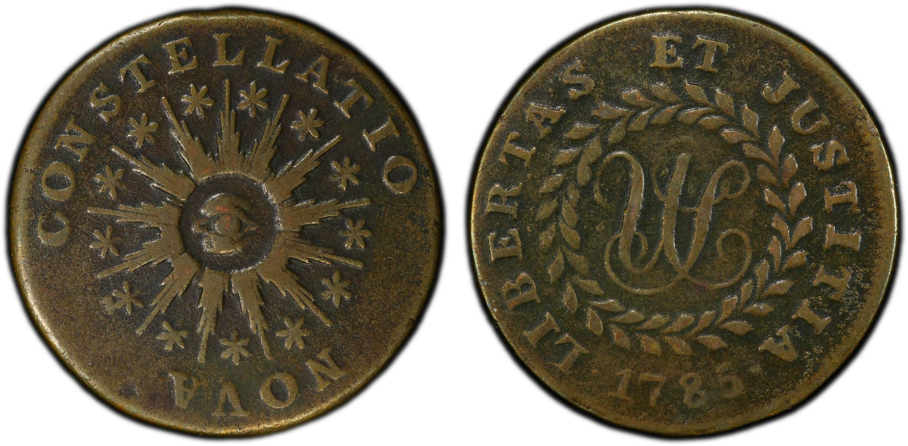 UNITED STATES: AE halfpenny, 1785, KM-EA9, Nova Constellatio copper, large date, pointed rays variety, environmental damage, PCGS graded VF details. The large and small date varieties can be distinguished by the presence (large date) or lack (small date) of dots on either side of the date. Additional die varieties exist. Only 1785-dated coins use the script lettering for the US on the reverse; block lettering is found on 1783- and 1786-dated coins.