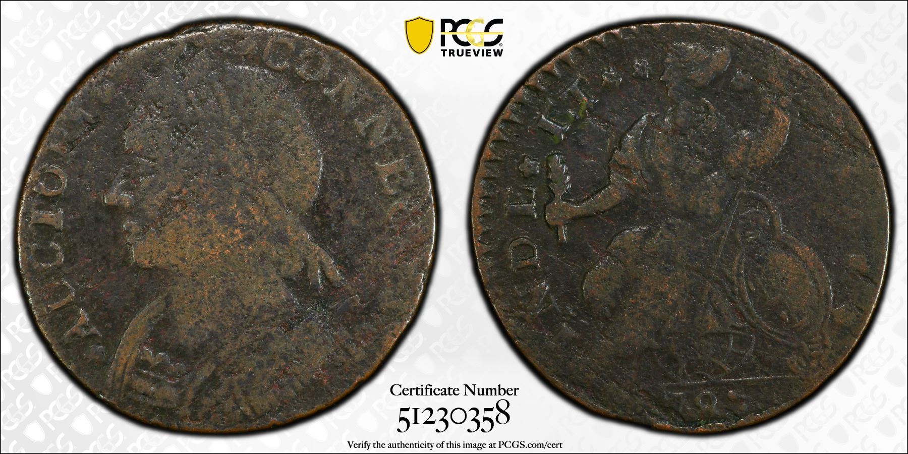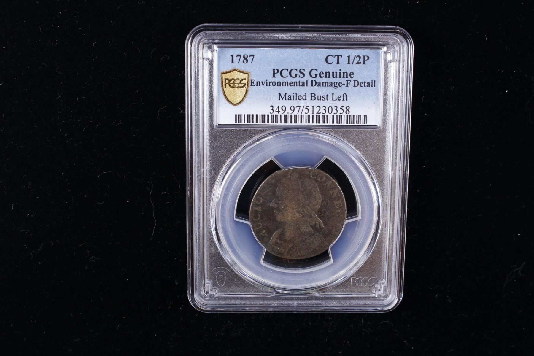 UNITED STATES: AE halfpenny, 1787, KM-3, Connecticut copper, mailed bust left, environmental damage, PCGS graded Fine details. Connecticut coppers have the most complex minting history of all colonial issues. There were more that 355 die combinations, with at least 126 type varieties having 26 distinct bust styles made by at least six different mints. Yet, the basic design of the Connecticut Coppers never changed; all issues imitated the British halfpenny. The obverse depicted the bust of a man wearing a laurel wreath, the figure sometimes faced to the left (as George II) or to the right (as George III) and was either clad in mail armor or draped in a toga. The obverse legend was one of several forms of Latin abbreviations for the phrase "By the authority of Connecticut." The reverse depicted a seated personification of Liberty closely resembling the British Britannia with a legend consisting of an abbreviated form of "Independence and Liberty."
