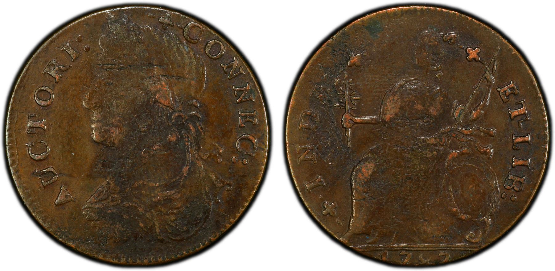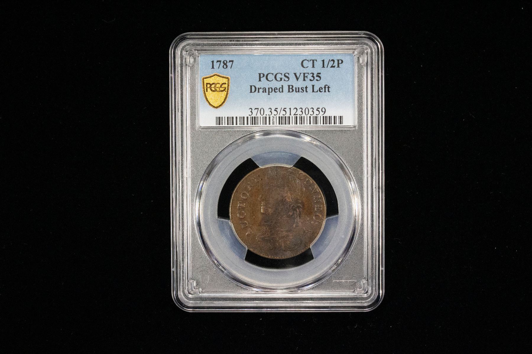 UNITED STATES: AE halfpenny, 1787, KM-3, Connecticut copper, draped bust left, PCGS graded VF35. Connecticut coppers have the most complex minting history of all colonial issues. There were more that 355 die combinations, with at least 126 type varieties having 26 distinct bust styles made by at least six different mints. Yet, the basic design of the Connecticut Coppers never changed; all issues imitated the British halfpenny. The obverse depicted the bust of a man wearing a laurel wreath, the figure sometimes faced to the left (as George II) or to the right (as George III) and was either clad in mail armor or draped in a toga. The obverse legend was one of several forms of Latin abbreviations for the phrase "By the authority of Connecticut." The reverse depicted a seated personification of Liberty closely resembling the British Britannia with a legend consisting of an abbreviated form of "Independence and Liberty."