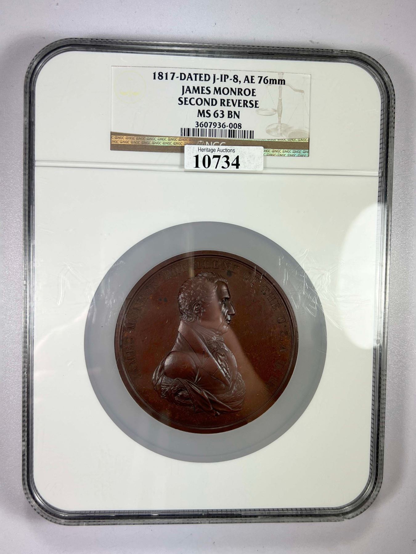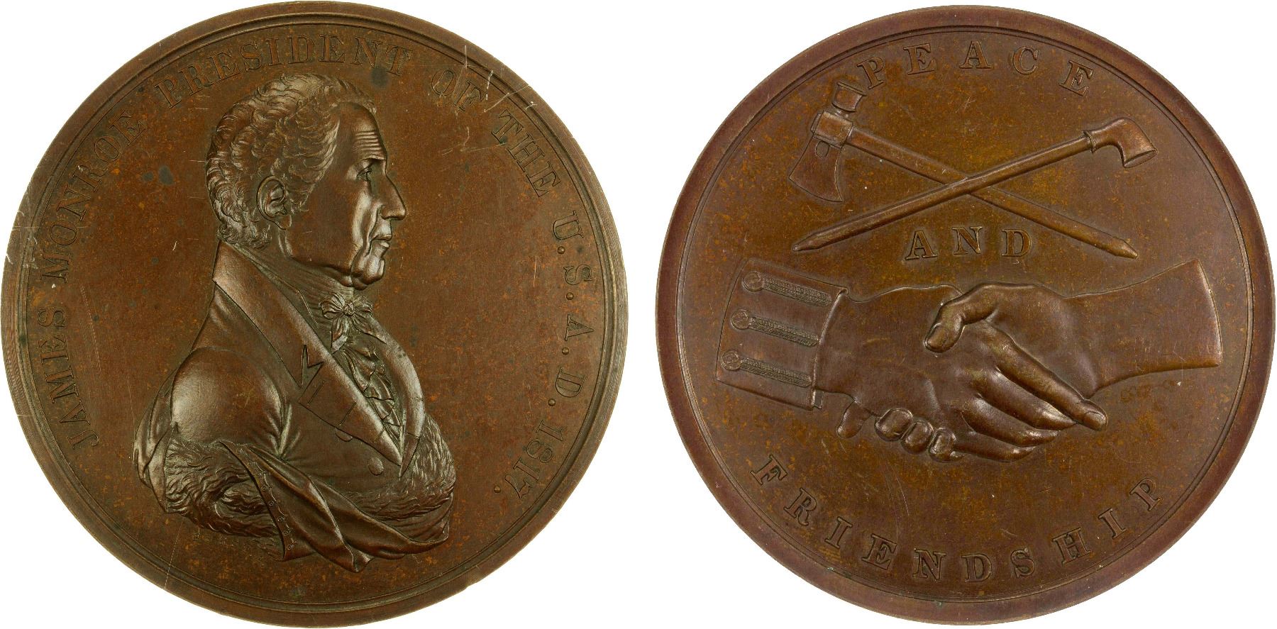 UNITED STATES: AE medal, 1817, Julian-IP-8b, large-sized (76mm) Indian Peace Medal by Moritz Furst and John Reich, Second Reverse, bust right with JAMES MONROE PRESIDENT OF THE U: S. A. D. 1817. around // crossed peace pipe and tomahawk, with clasped hands below and legend PEACE / AND / FRIENDSHIP, nice even brown coloration, NGC graded MS63 BN, ex Heritage Auction 1201, Lot 10734; ex The Marlor Collection.