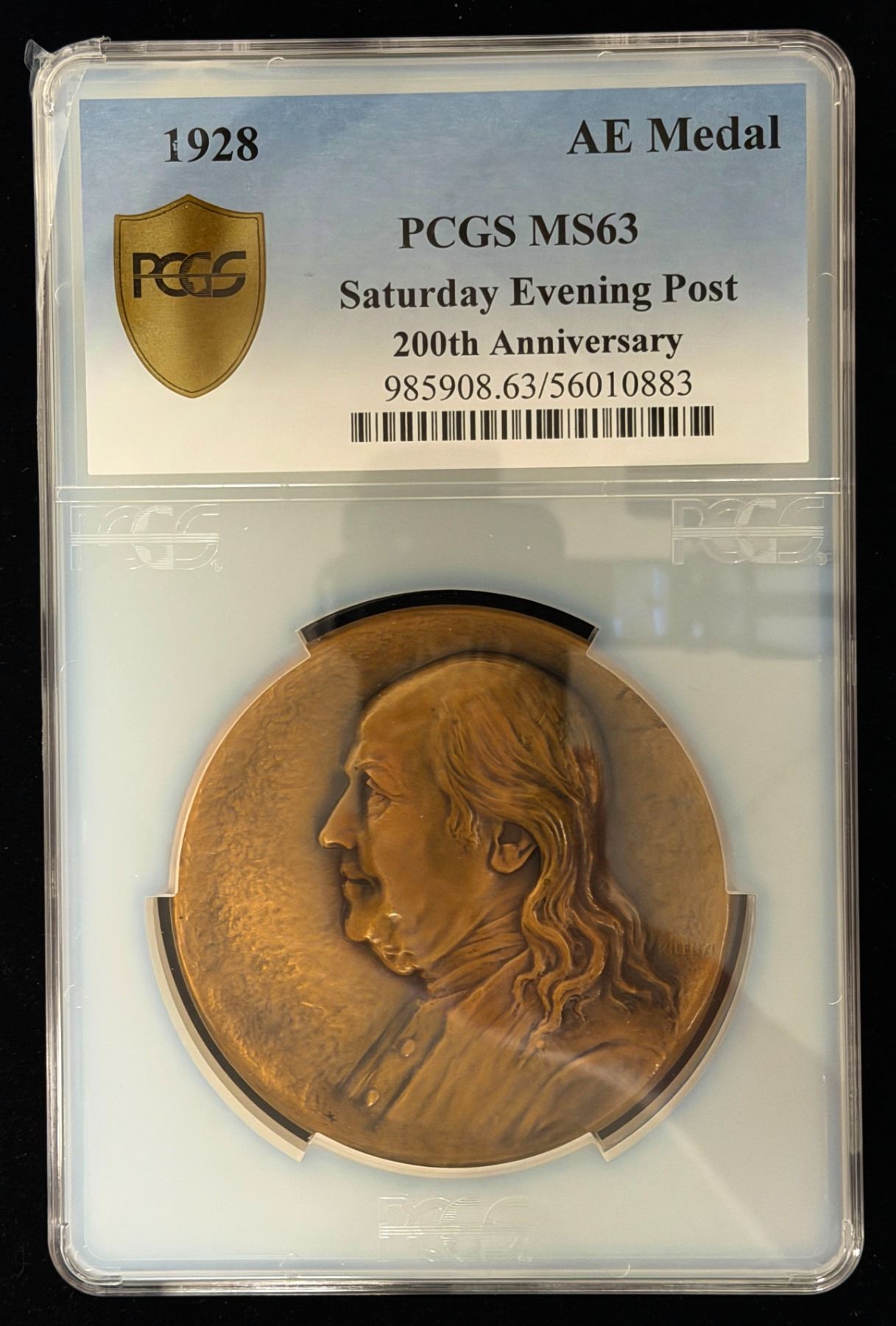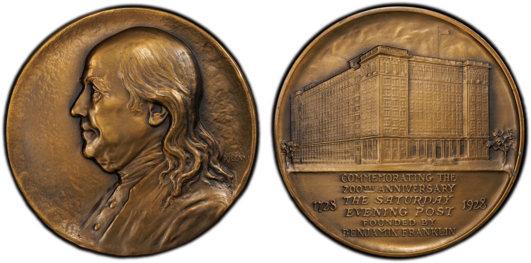 UNITED STATES: AE medal, 1928, 101mm bronze medal by Julio Kilenyi for the 200th Anniversary of the Saturday Evening Post; mature bust of Benjamin Franklin facing left, on stippled field, KILENYI at right // high-rise headquarters building, COMMEMORATING THE / 200TH ANNIVERSARY / THE SATURDAY / EVENING POST / FOUNDED BY / BENJAMIN FRANKLIN; on left and right, "1728" and "1928", struck by Whitehead and Hoag, a lovely quality example of this scarce and popular medal! PCGS graded MS63.