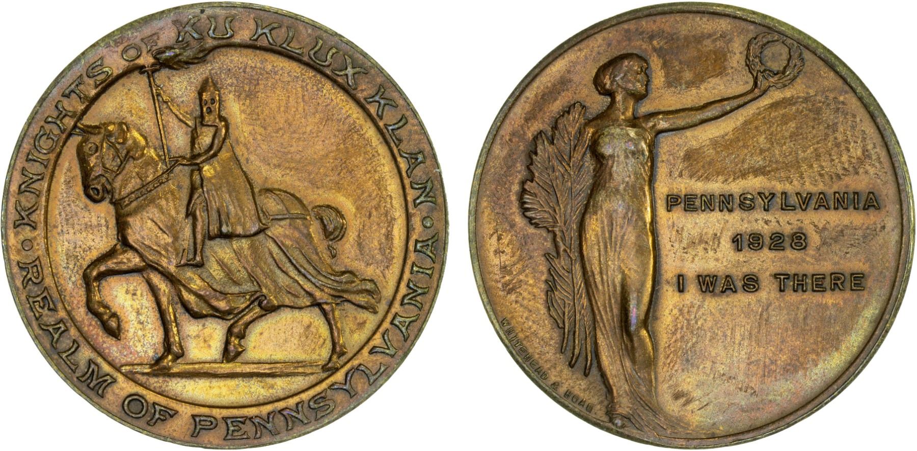 UNITED STATES: AE token (12.95g), 1928, Birdsell-KK-229, 32mm bronze token for the Pennsylvania Ku Klux Klan by Whitehead and Hoag, Ku Klux Klan knight on horse advancing left and carrying lighted torch, with KNIGHTS OF KU KLUX KLAN - REALM OF PENNSYLVANIA around // female figure standing facing with head right holding three floral branches in right hand and victory wreath in left hand with PENNSYLVANIA / 1928 / I WAS THERE in right field, light fingermarks and tone with some red, plain edge, Unc. This item was originally produced by a regime which perpetrated crimes against humanity, war crimes, mass murder, and other acts of violence. Our firm does not endorse such activities and only offers this item as an artifact of history to further research and civil enlightenment.