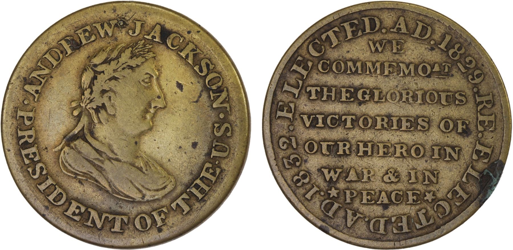 UNITED STATES: AE token (6.32g), "1829", Bowers-W-09-25b, Low-04, HT-6, 27mm brass Hard Times token, laureate and draped bust right with ANDREW JACKSON - PRESIDENT OF THE U S around // WE / COMMEMOat / THE GLORIOUS / VICTORIES OF / OUR HERO IN / WAR & IN / *PEACE* with "ELECTED A D 1829 (sic) RE ELECTED A D 1832" around, small attempted piercing, reverse oxidation spot, plain edge, VG-F.