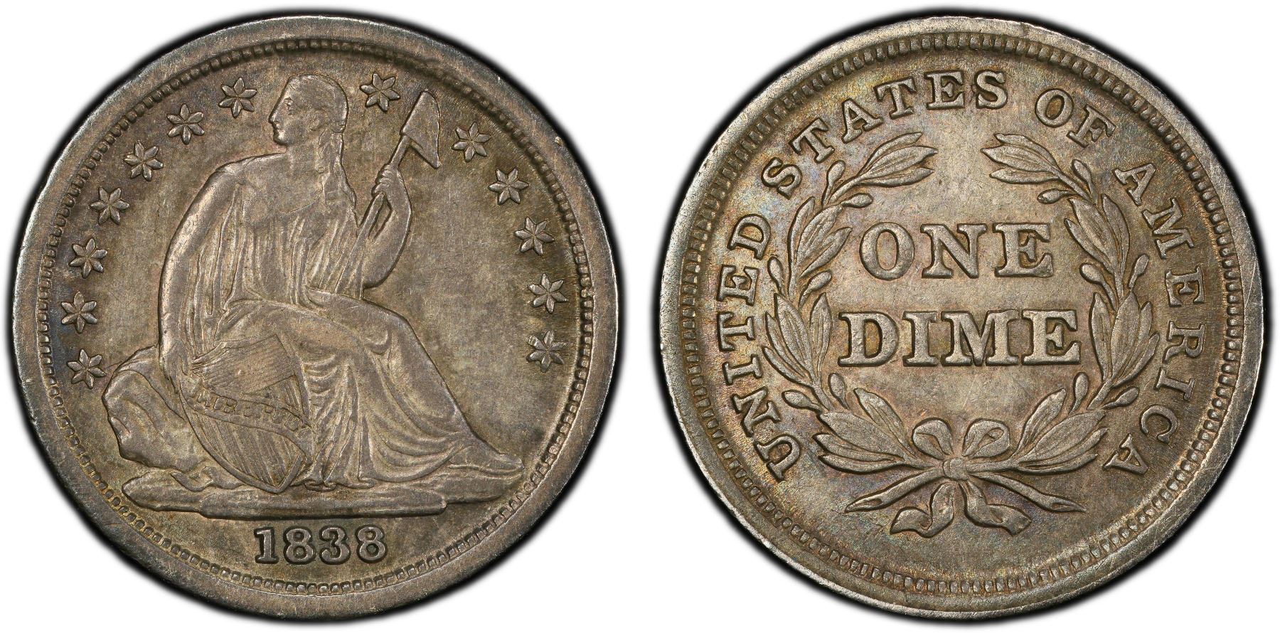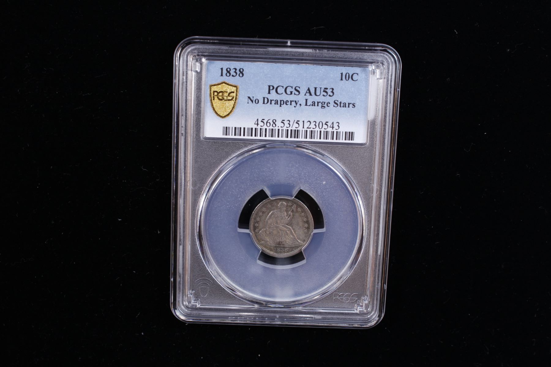UNITED STATES: AR 10 cents, 1838, KM-63.1, Liberty Seated type, without drapery, large stars variety, PCGS graded AU53. The 1913-S Type 2 Buffalo nickel is one of the key dates in the series. It is the third lowest mintage and as such is highly desirable in circulated grades. In fact, only the 1916 double die and 1918/7-D are worth more in circualted grades. Gem MS65 examples are only occasionally available.