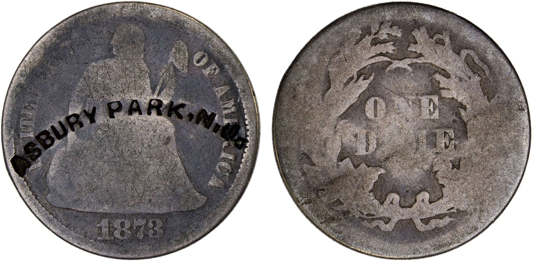 UNITED STATES: AR 10 cents, merchant counterstamp ASHBURY PARK N.J. on 1873 silver Liberty Seated dime, Fine.