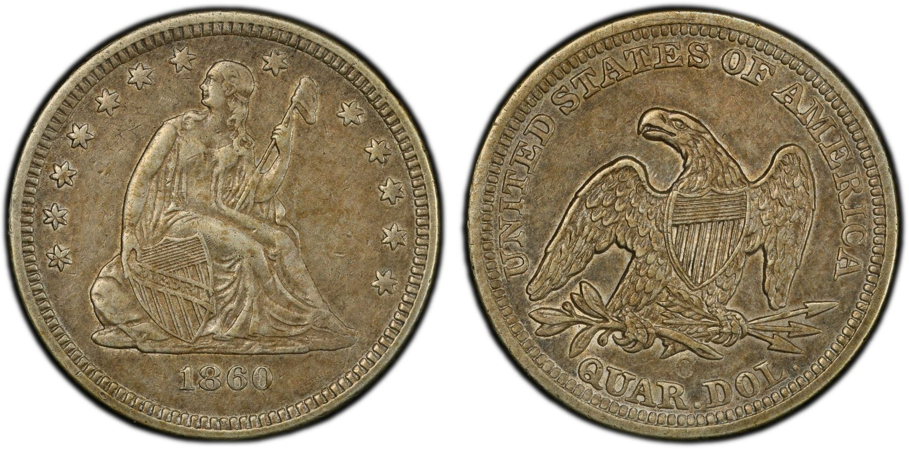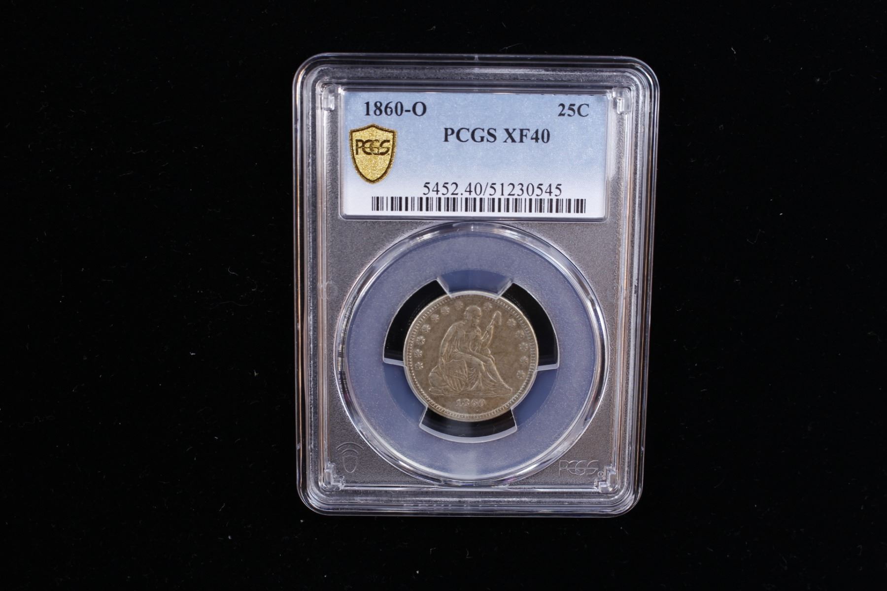 UNITED STATES: AR 25 cents, 1860-O, KM-A64.2, Liberty Seated type 2, without motto, PCGS graded EF40. The 1913-S Type 2 Buffalo nickel is one of the key dates in the series. It is the third lowest mintage and as such is highly desirable in circulated grades. In fact, only the 1916 double die and 1918/7-D are worth more in circualted grades. Gem MS65 examples are only occasionally available.