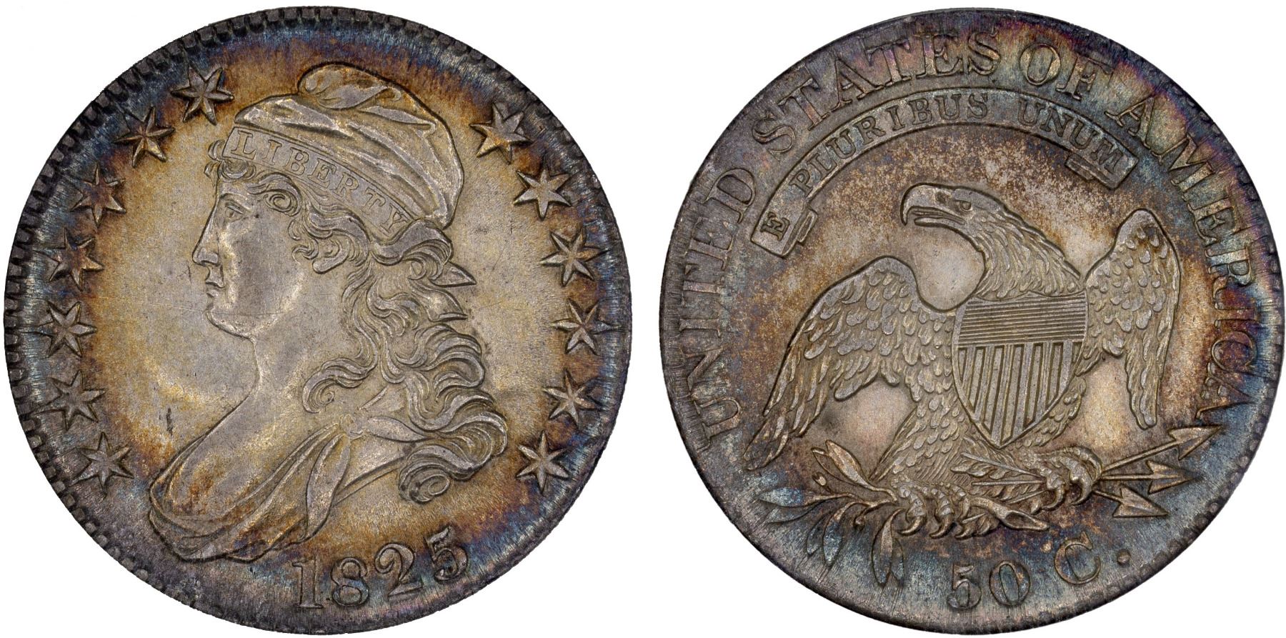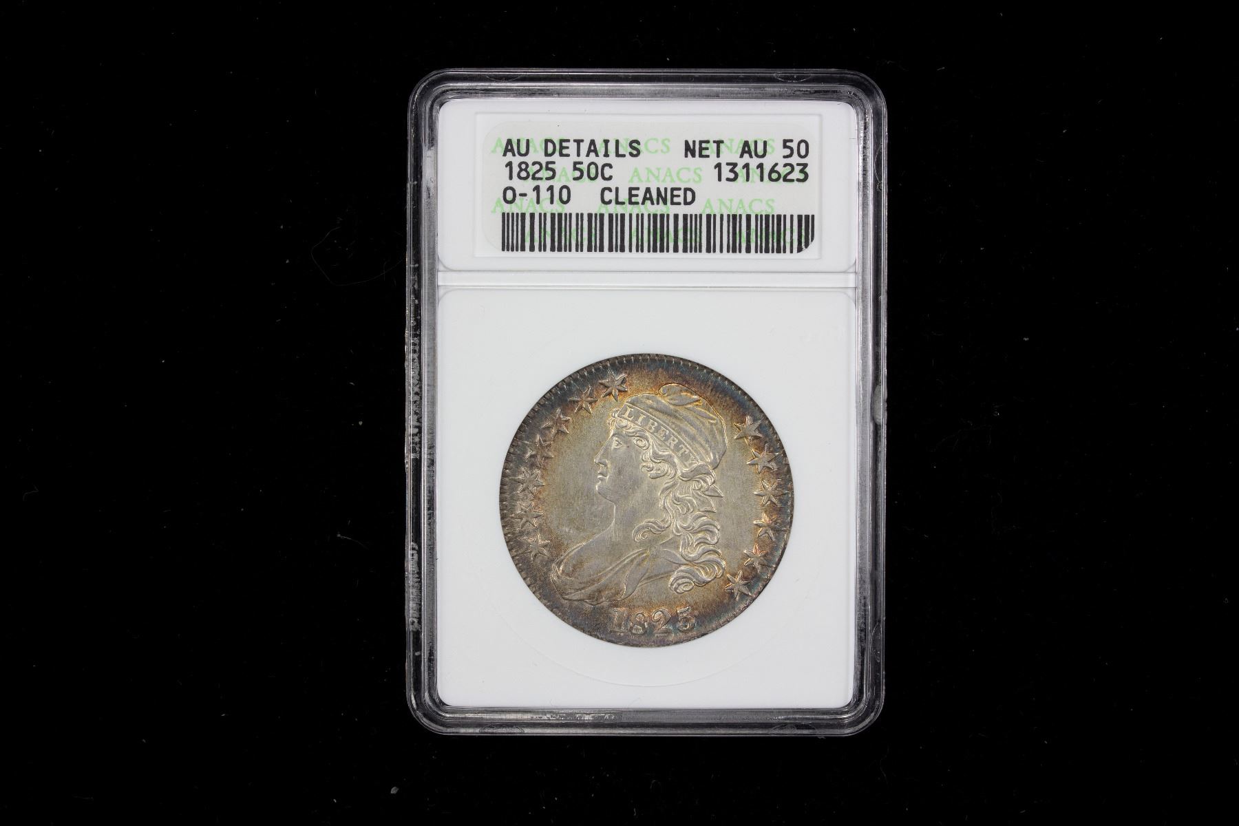 UNITED STATES: AR 50 cents, 1825, KM-37, Overton -110, Capped Bust type, cleaned, with attractive iridescent toning around border, ANACS graded Net AU50. In scarce ANACS Generation 4 holder. Produced from 1991 to 1996, this is the last of the slightly smaller white 'soapbox' holders. It features a new front label with the addition of a barcode.