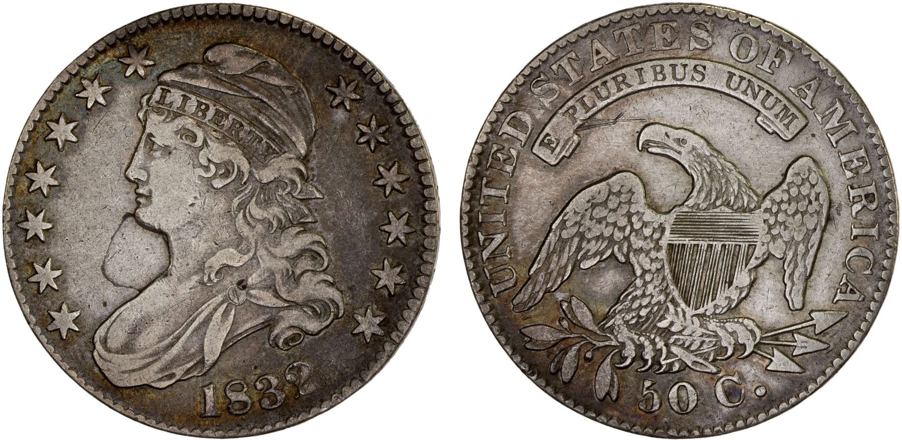 UNITED STATES: AR 50 cents, 1832, KM-37, Capped Bust type, lightly cleaned, F-VF.