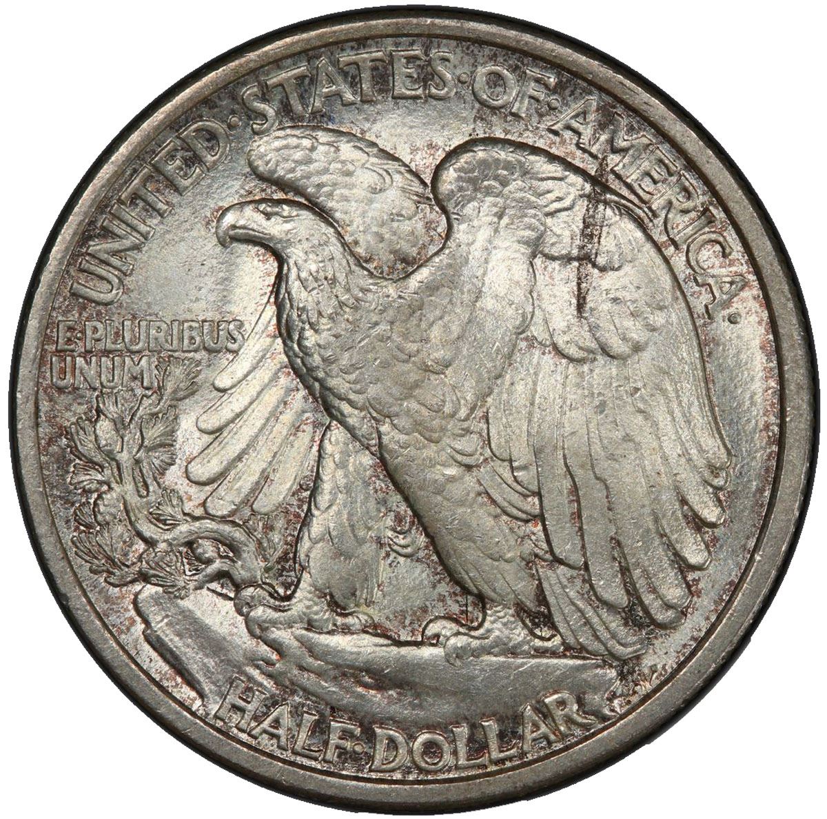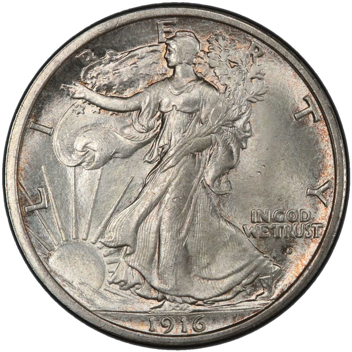 UNITED STATES: AR 50 cents, 1916-D, PCGS graded MS65, Liberty Walking type, superb example with satin luster! Most examples of 1916-D half dollars are generally well struck, better so overall than those of the Philadelphia and San Francisco Mints. They make ideal type coins to illustrate this design as it debuted.