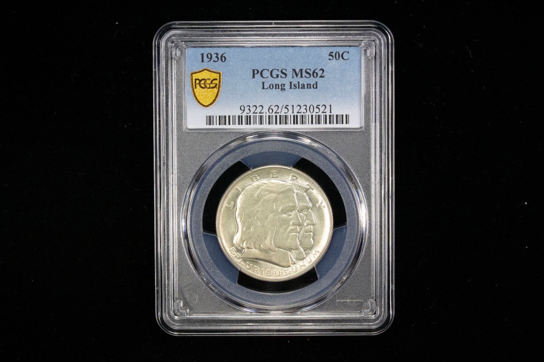 UNITED STATES: AR 50 cents, 1936, KM-182, Long Island Tercentenary, PCGS graded MS62. The coins were authorized to commemorate the 300th anniversary of the settlement of Long Island by Dutch colonists. Designs for the coin were created by Howard Kenneth Weinman, the son of Adolph A Weinman, who had designed the Mercury Dime and Walking Liberty Half Dollar.