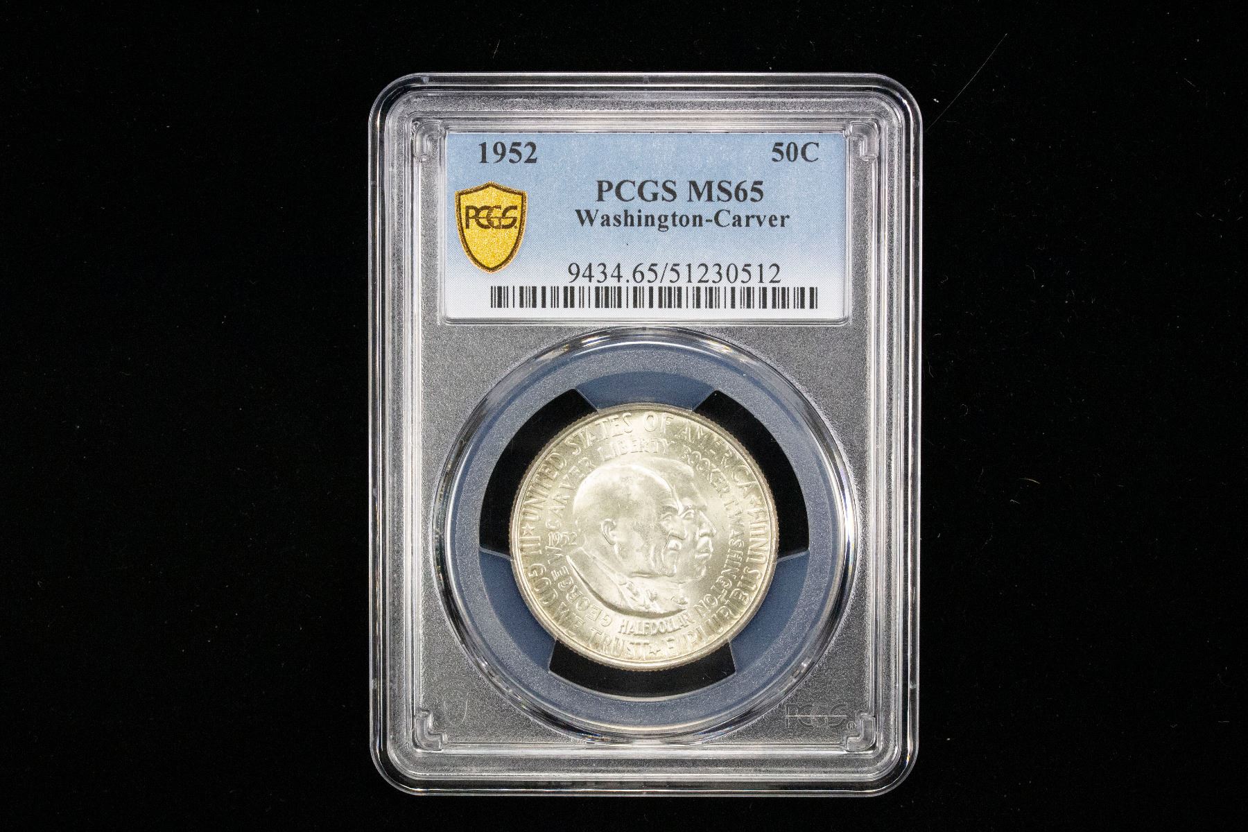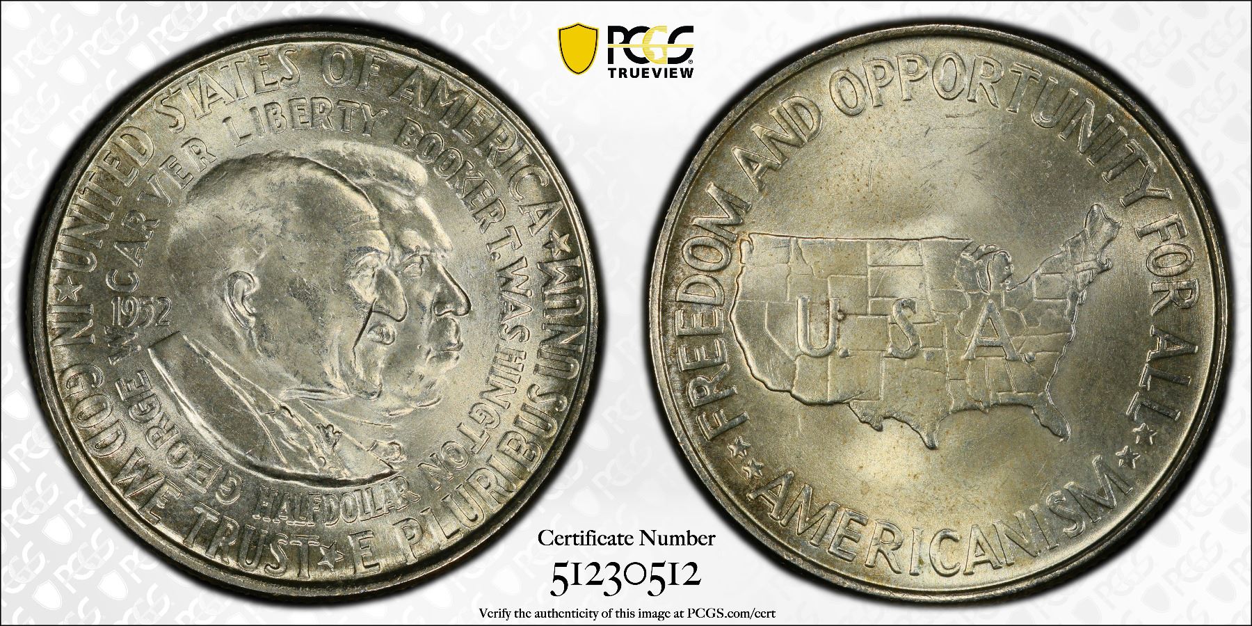 UNITED STATES: AR 50 cents, 1952, KM-200, Washington-Carver Commemorative, a superb mint state example! PCGS graded MS65. The last design released of early American commemorative coins was the George Washington Carver Half Dollar. The authorizing legislation passed in 1951 called for the melting of all unsold Booker T. Washington Half Dollars and the recoinage into coins bearing conjoined profile portraits of George Washington Carver and Booker T. Washington.