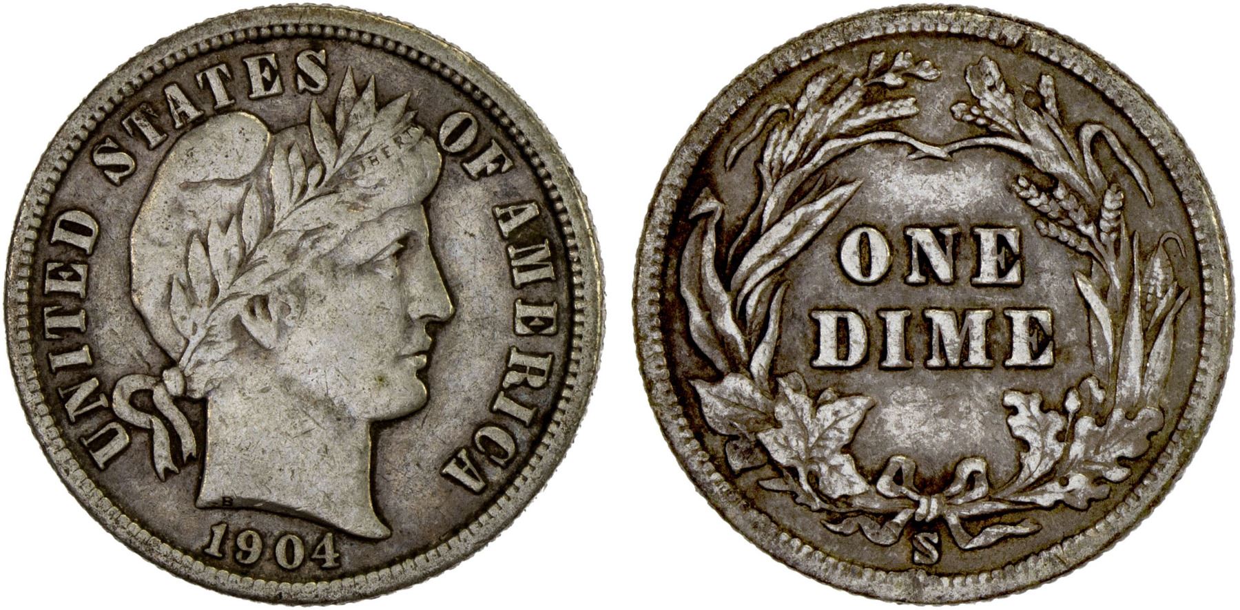UNITED STATES: AR dime, 1904-S, KM-113, Barber type, better date/mintmark, F-VF.