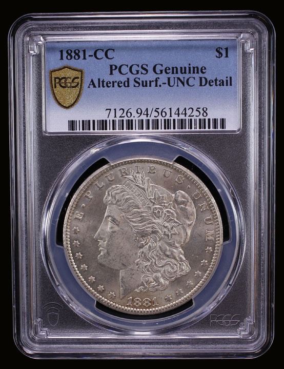 UNITED STATES: AR dollar, 1881-CC, KM-110, Morgan type, attractive satin luster, altered surfaces, PCGS graded Unc details.