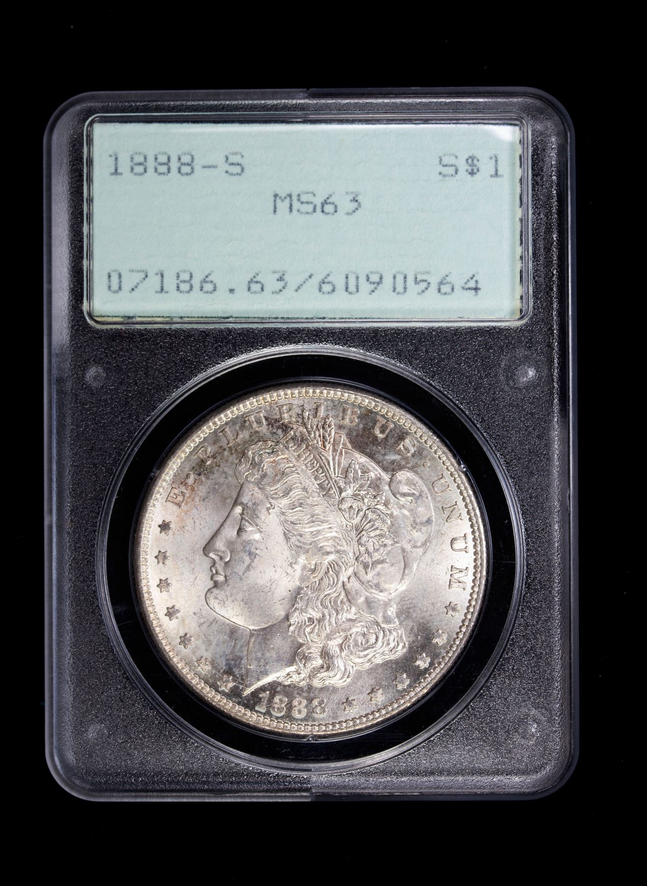 UNITED STATES: AR dollar, 1888-S, KM-110, PCGS graded MS63, "rattler" PCGS holder