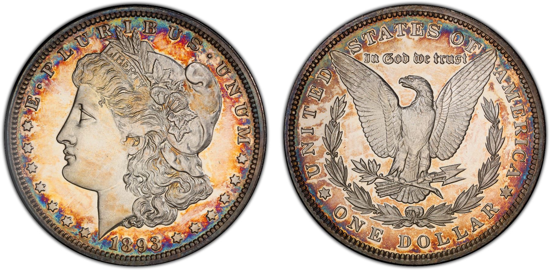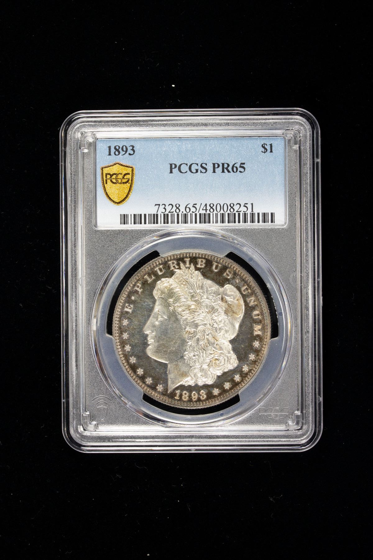 UNITED STATES: AR dollar, 1893, KM-110, Morgan type, mintage of only 792 coins, a superb proof quality example with light peripheral toning! PCGS graded Proof 65, R.