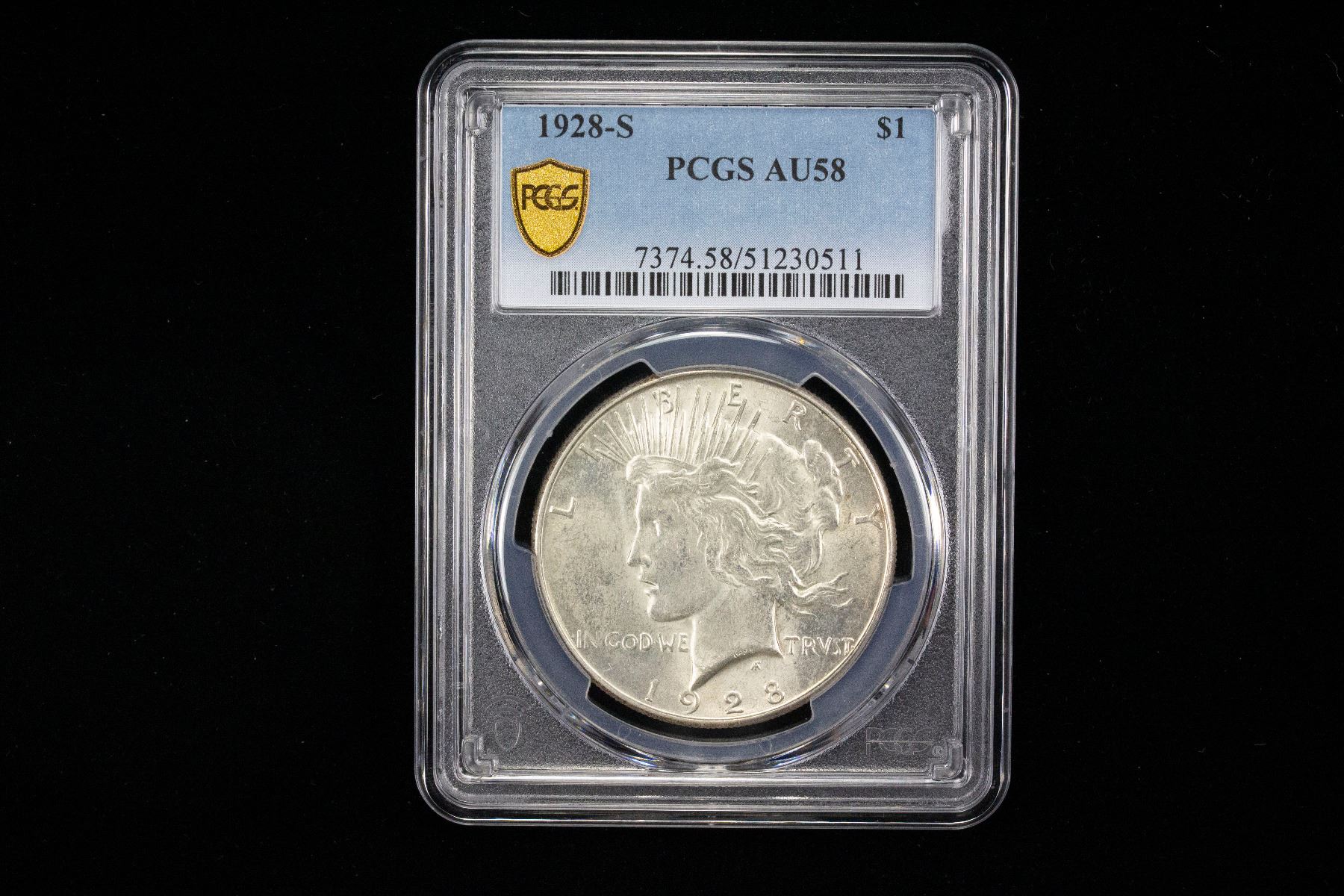 UNITED STATES: AR dollar, 1928-S, KM-150, Peace type 2 low relief, an attractive nearly mint state example, PCGS graded AU58.