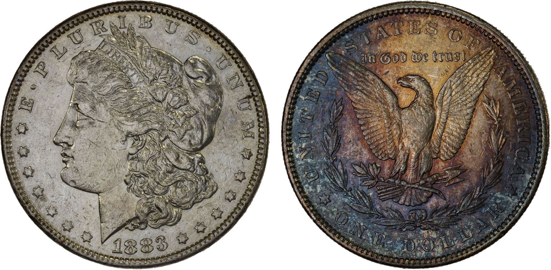 UNITED STATES: AR dollar (26.73g), 1883, KM-110, Morgan dollar type, cleaned, nice multicolored reverse tone, XF.