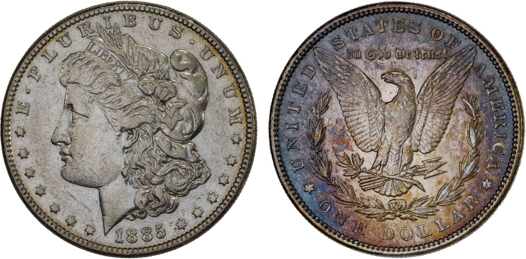UNITED STATES: AR dollar (26.73g), 1885, KM-110, Morgan dollar type, cleaned, nice multicolored reverse tone, XF.