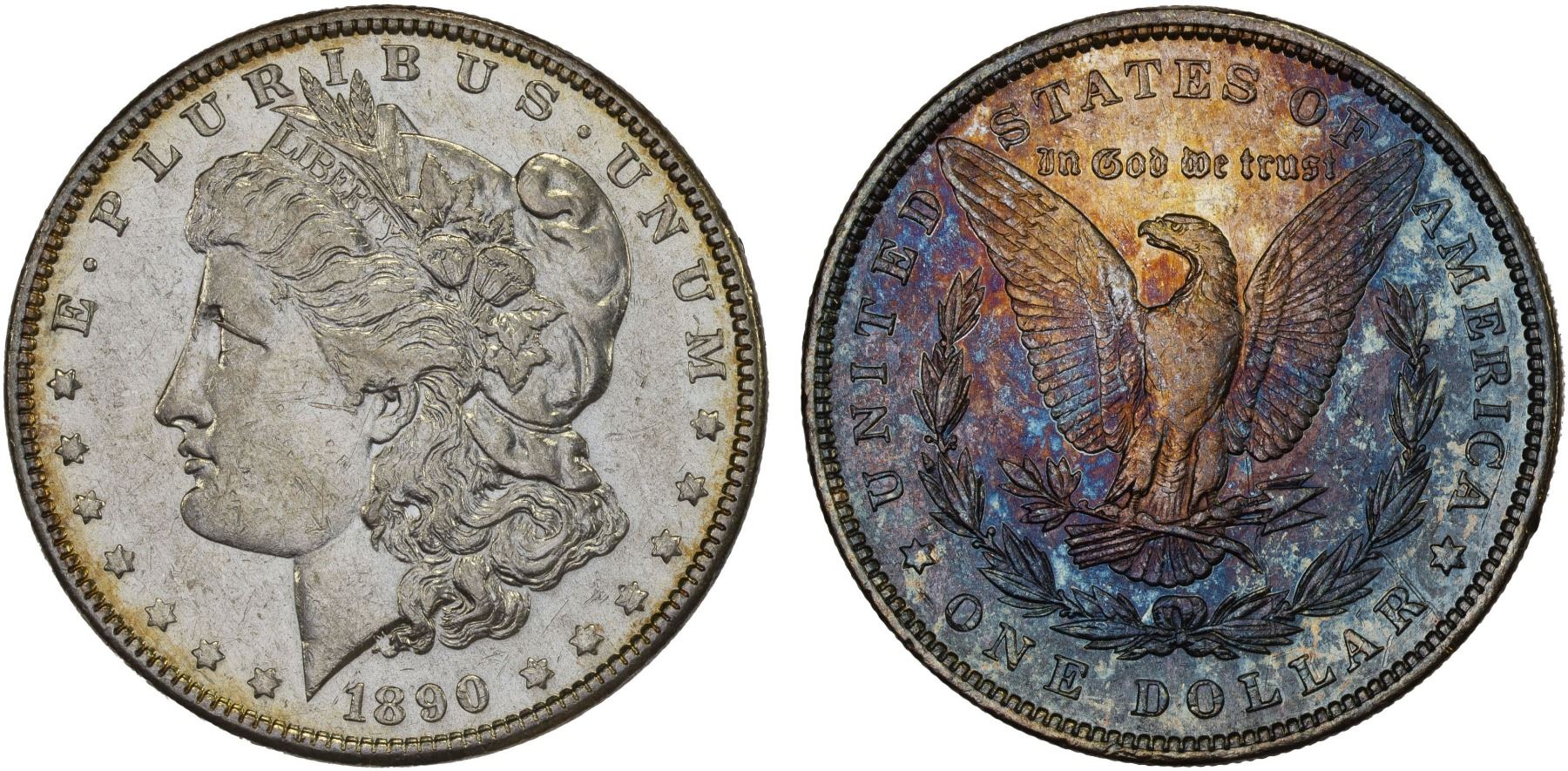 UNITED STATES: AR dollar (26.73g), 1890, KM-110, cleaned, nice multicolored reverse tone, XF.