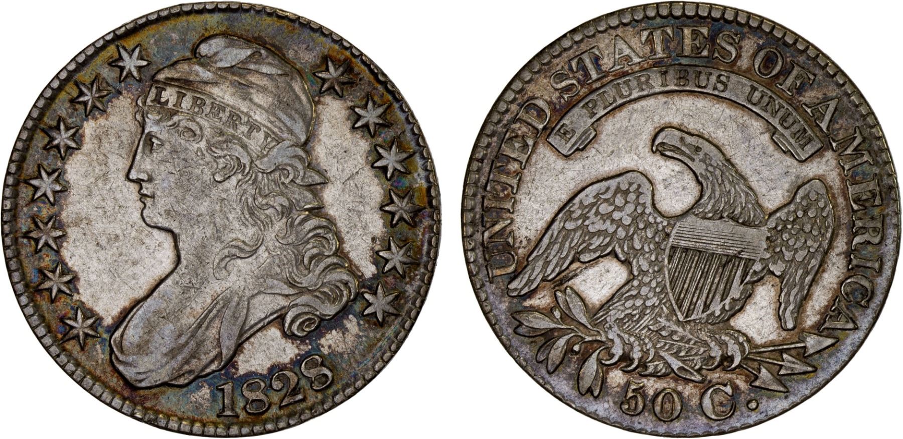 UNITED STATES: AR half dollar, 1828, KM-37, small 8s, square-base 2, large letters, attractive peripheral tone, VF-XF.