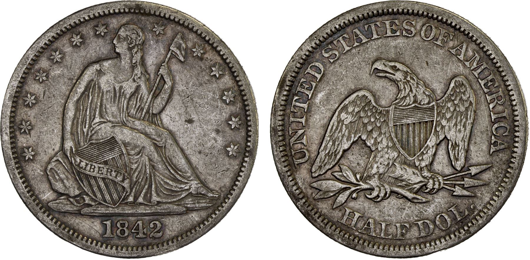 UNITED STATES: AR half dollar, 1842, KM-68, Seated Liberty type with no motto, variety with medium date, light scratches, VF.