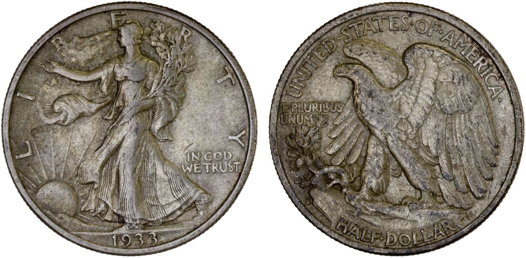 UNITED STATES: AR half dollar, 1933-S, KM-142, Walking Liberty type, a bit unevenly toned, better date/mintmark, XF.