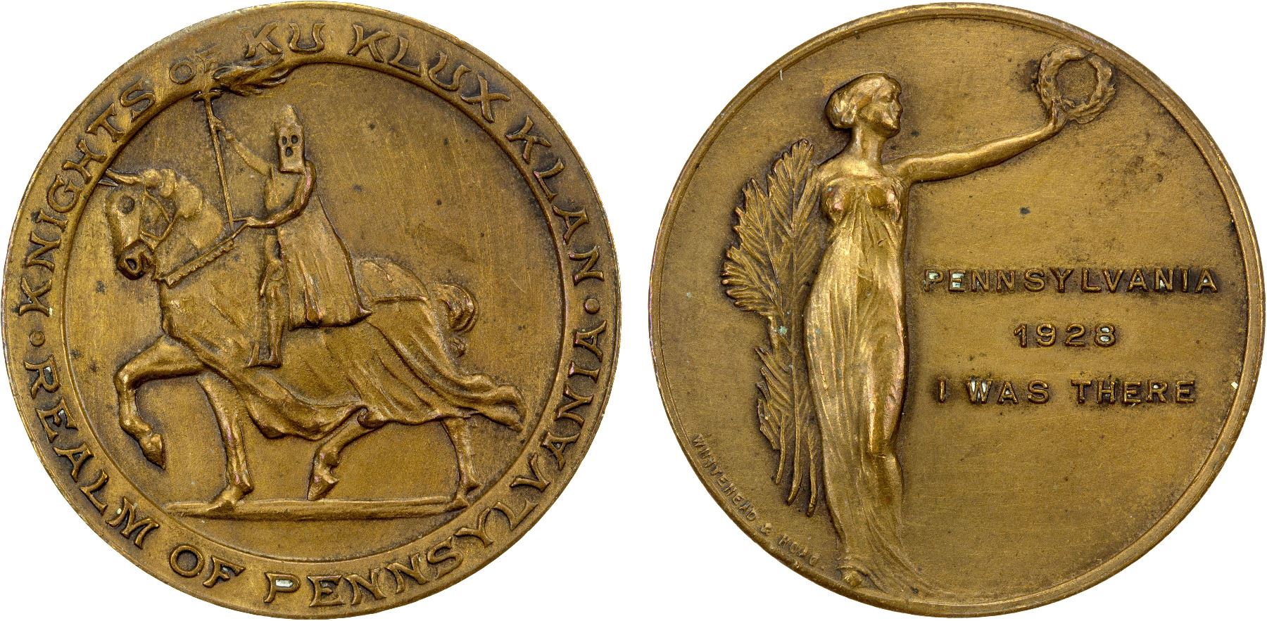 UNITED STATES: AR medal (13.56g), 1928, 32mm bronze medal for the Ku Klux Klan in Pennsylvania by Whitehead and Hoag, Klansman with torch on horse moving left within inner circle with KNIGHTS OF KU KLUX KLAN. REALM OF PENNSYLVANIA. around // draped female figure at left holding laurel wreath with extended arm with PENNSYLVANIA / 1928 / I WAS THERE in field at right, lightly cleaned, plain edge, EF.