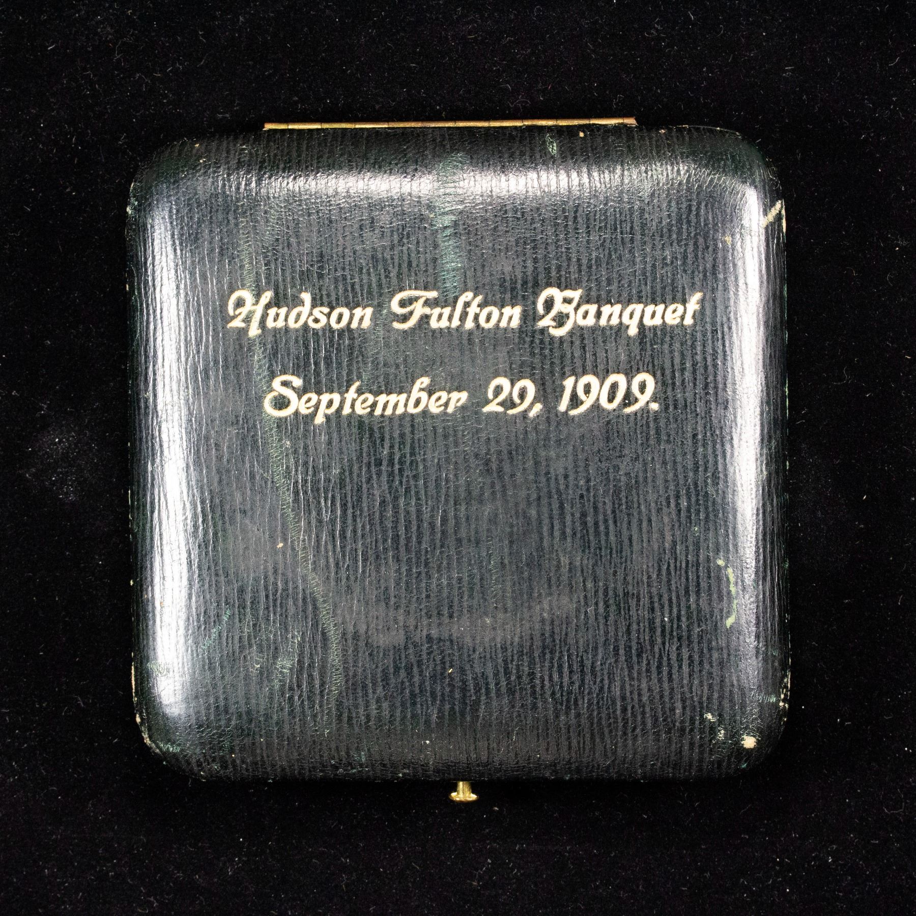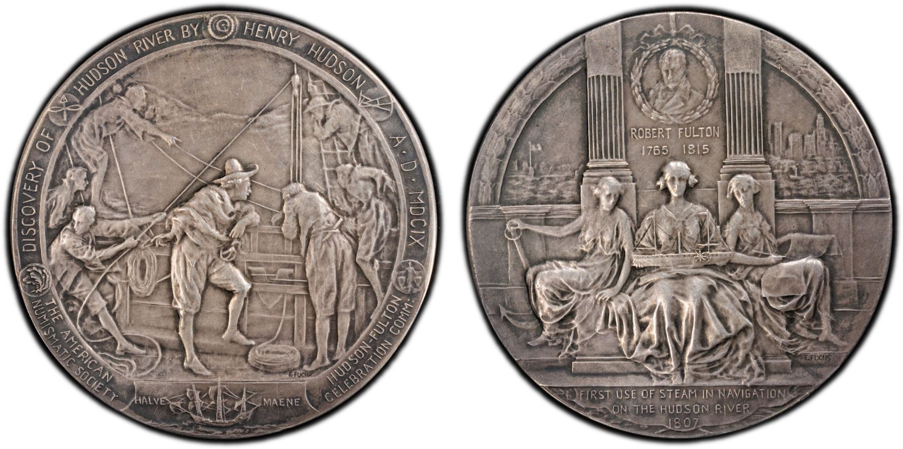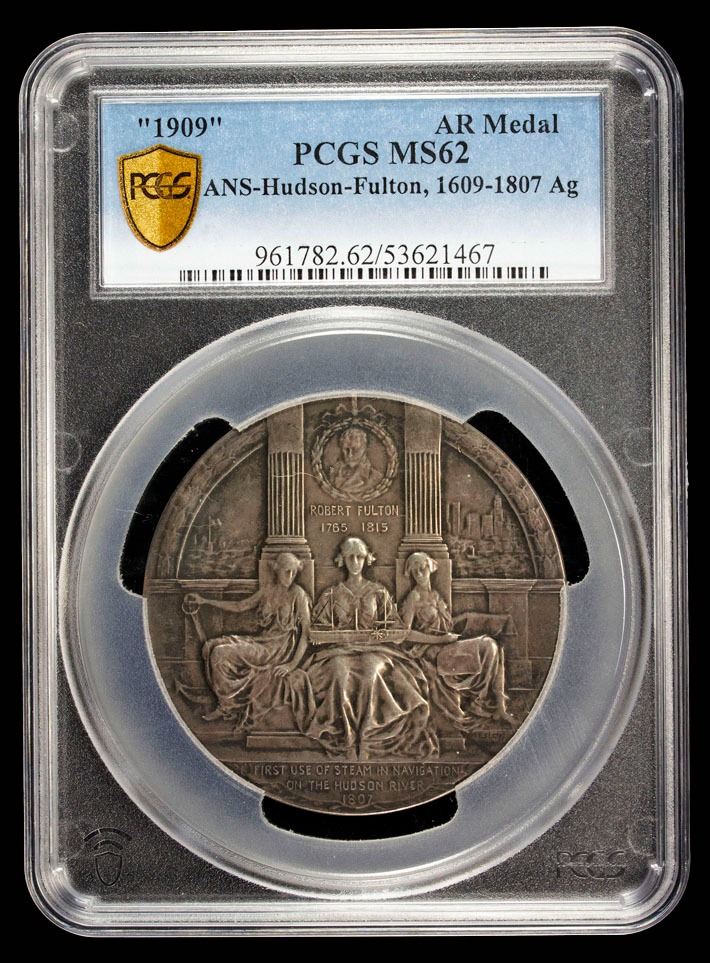 UNITED STATES: AR medal, 1909, 51mm silver medal by Emil Fuchs for the Hudson-Fulton Celebration; DISCOVERY OF HUDSON RIVER BY HENRY HUDSON / A. D. MDCIX / THE AMERICAN NUMISMATIC SOCIETY / HUDSON FULTON CELEBRATION COMM. around Navigator Henry Hudson on deck of ship Halve Maene with sailors, HALVE MAENE either side of small ship below, and E. FUCHS at sailors feet // "ROBERT FULTON / 1765 1815" below his bust within laurel wreath, seated figures of Navigation, Invention and History with center figure holding model of Robert Fulton's North River Steamboat, E. FUCHS on base, in exergue "FIRST USE OF STEAM IN NAVIGATION / ON THE HUDSON RIVER / 1807", on edge STERLING - WHITEHEAD-HOAG, a pleasing mint state example with original case of issue! PCGS graded MS62. Celebrating both the 300th anniversary of Henry Hudson’s discovery of the Hudson River and the 100th anniversary of Robert Fulton’s first successful commercial application of the paddle steamer by Engineer and Steamboat Builder Robert Fulton.