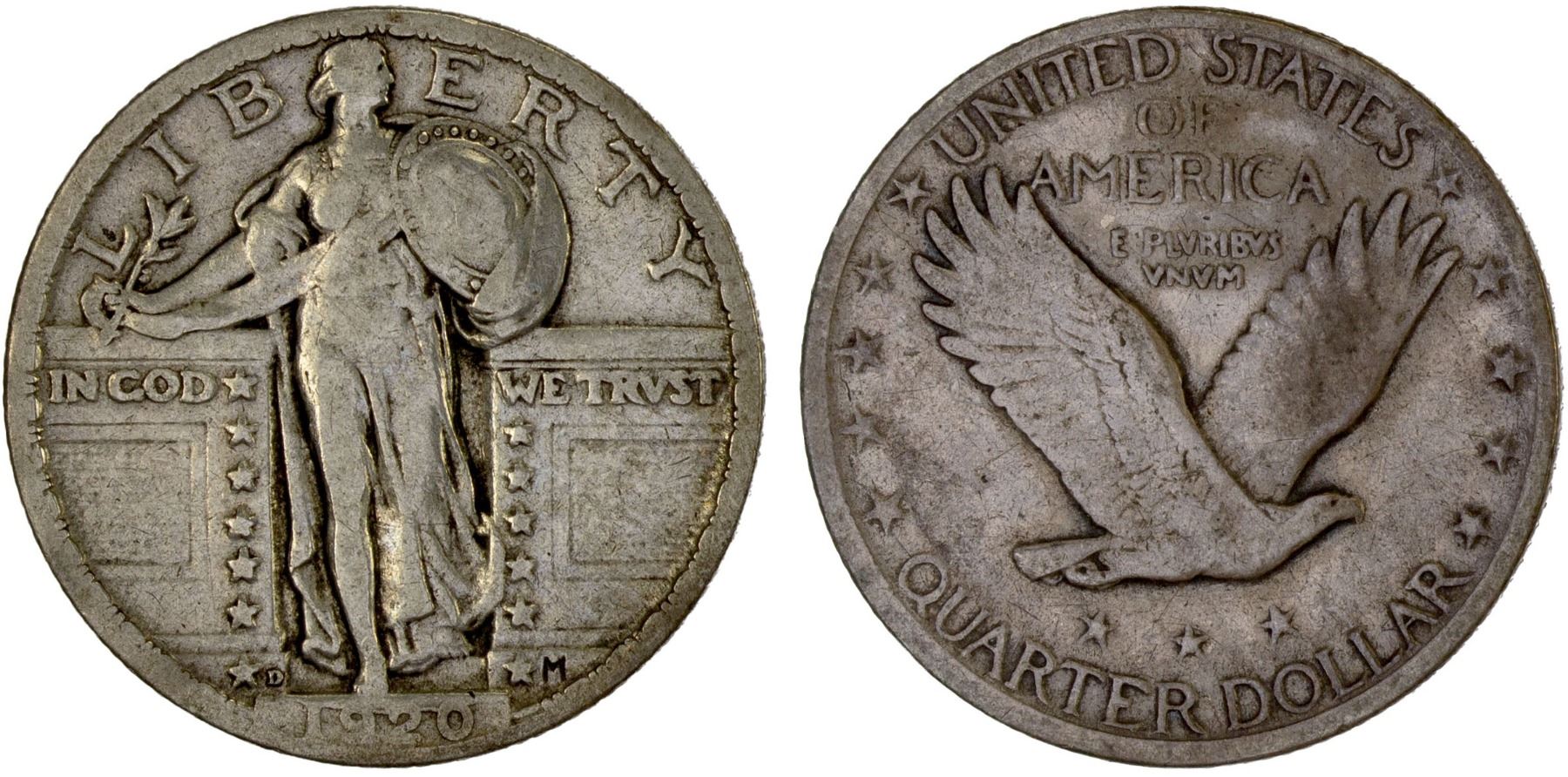 UNITED STATES: AR quarter, 1920-D, KM-145, Standing Liberty type, somewhat weak date, as is typical, better date/mintmark, Fine.
