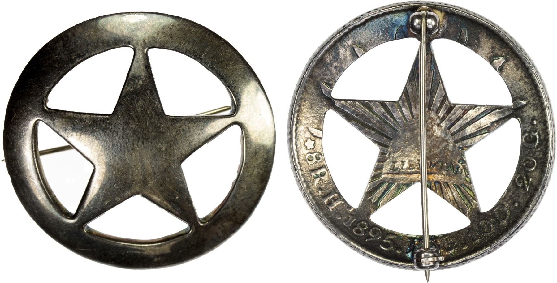 UNITED STATES: AR sheriff's badge (15.93g), 38mm star-shaped silver sheriff's badge hand carved from a Mexico 8 reales dated 1895 from the Hermosillo Mint, assayer FG, with pin back added, VF, RRR. The style of this sheriff's badge would indicate it was likely issued and used in Arizona Territory as the Hermosillo Mint was located in the Mexican state of Sonora just across the border from Arizona Territory and was the closet mint at that time to the Territory.