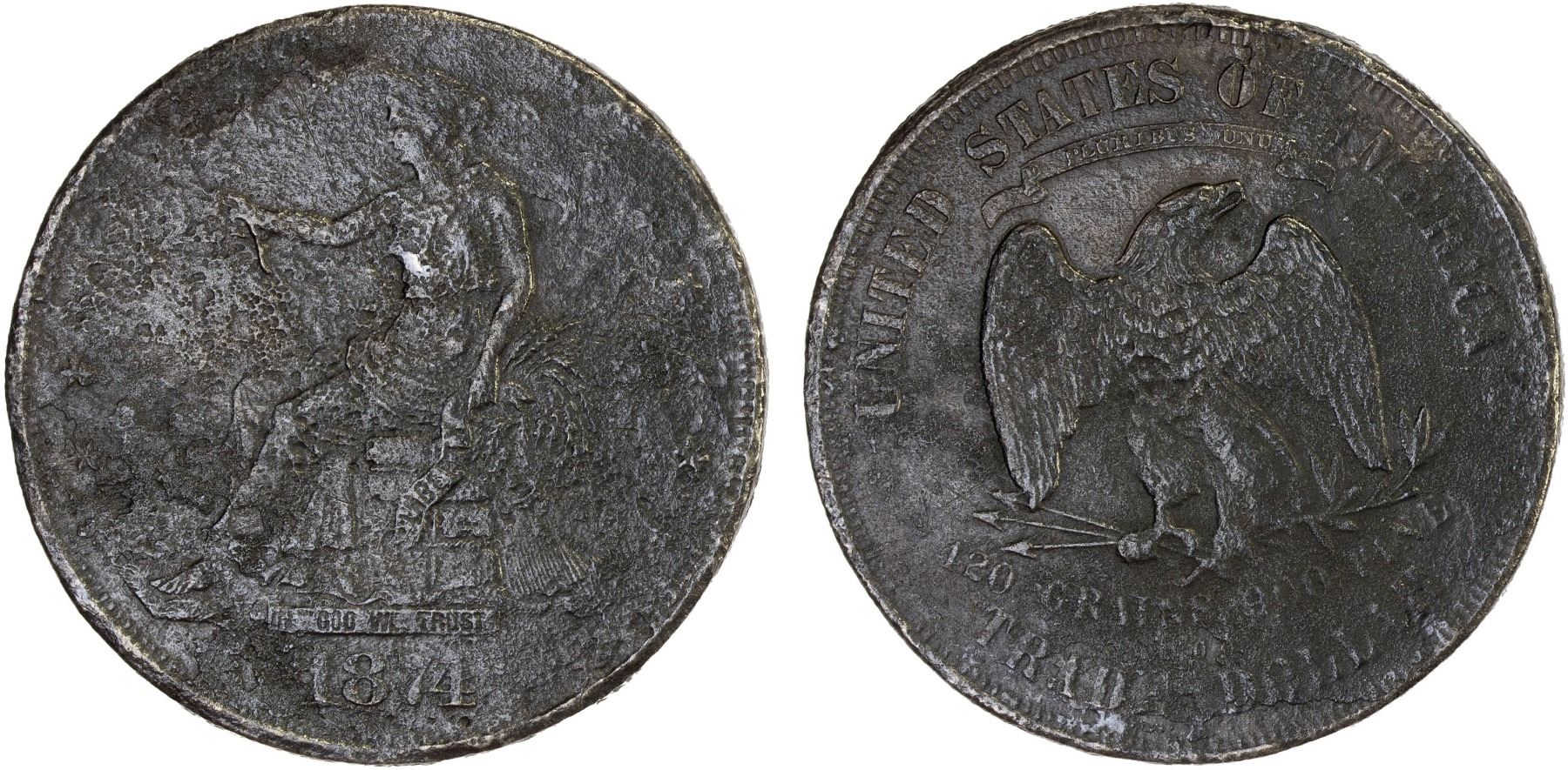 UNITED STATES: AR trade dollar, 1874-CC, KM-108, from the wreck of the Pacific Mail Steamship Company ship SS Japan, salt water damage, Good. On February 20, 1865, six weeks before his assassination, President Abraham Lincoln approved a bill to establish the Pacific Mail Steam Ship Company as the conduit to formalize trade with China following the completion of the transcontinental "Pacific Railroad." The four ships commissioned for service between San Francisco, Yokohama and Hong Kong were the SS China, SS Great Republic, SS America, and the SS Japan. Constructed between 1866 to 1868, they were the largest, most impressive sidewheel steamships yet built.On November 18, 1874, the SS Japan departed San Francisco on a routine scheduled voyage to Hong Kong, stopping in Yokohama, with 425 Chinese Passengers eager to return home after years of labor in California, each person carrying an average of $300 value in gold coin. Also loaded aboard and stowed away in the ship's treasure tank were 168 boxes with $358,508 in newly minted 1874 trade dollar coins.Around midnight on December 17, 1874, fire broke out in the coal bulkhead located amidships, adjacent to the treasure tank. The fire spread quickly from the coal bulkhead, smoke and flames engulfing the wooden center structures of the SS Japan trapping many aboard. Some managed to jump into the dark violent waters. In about 45 minutes the SS Japan was totally engulfed in flames. When the morning of December 18 dawned, the SS Japan was gone with 151 crew and passengers saved in lifeboats and almost 400 Chinese emigrants lost in the fire, on the raging sea and within the sinking hulk of the great ship. The shocking news of the loss of the SS Japan initiated a search and rescue dispatch of two ships of the US Navy's Asiatic fleet from Hong Kong to the wreck site two days later. They found no survivors but recovered a few Chinese bodies among the burnt flotsam in the ship's debris field.In January 1875, Hong Kong underwriters dispatched a schooner and a steamer under the command of Captain Roberts. He searched the area for 6 months, and finally in July located the wreck of the SS Japan in under 128 feet of water. Salvage operations ceased in 1877 after about 300,000 coins were recovered leaving the remaining 58,000 unrecoverable and considered lost. In 2007, the first of a small number of blackened and salt water damaged coins began to enter the market in Hong Kong discovered by fishermen near the wreck site likely doing 'dragnet fishing' or bottom trawling.