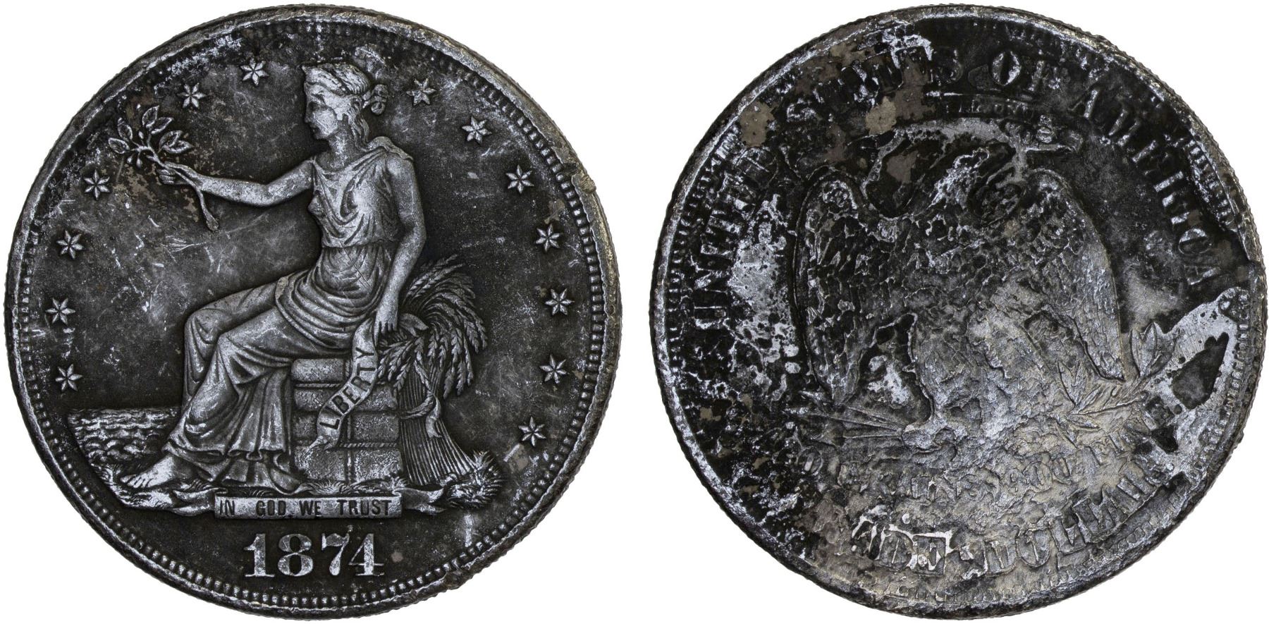 UNITED STATES: AR trade dollar, 1874, KM-108, from the wreck of the Pacific Mail Steamship Company ship SS Japan, salt water damage, Fine. On February 20, 1865, six weeks before his assassination, President Abraham Lincoln approved a bill to establish the Pacific Mail Steam Ship Company as the conduit to formalize trade with China following the completion of the transcontinental "Pacific Railroad." The four ships commissioned for service between San Francisco, Yokohama and Hong Kong were the SS China, SS Great Republic, SS America, and the SS Japan. Constructed between 1866 to 1868, they were the largest, most impressive sidewheel steamships yet built. On November 18, 1874, the SS Japan departed San Francisco on a routine scheduled voyage to Hong Kong, stopping in Yokohama, with 425 Chinese passengers eager to return home after years of labor in California, each person carrying an average of $300 value in gold coin. Also loaded aboard and stowed away in the ship's treasure tank were 168 boxes with $358,508 in newly minted 1874 trade dollar coins. Around midnight on December 17, 1874, fire broke out in the coal bulkhead located amidships, adjacent to the treasure tank. The fire spread quickly from the coal bulkhead, smoke and flames engulfing the wooden center structures of the SS Japan trapping many aboard. Some managed to jump into the dark violent waters. In about 45 minutes the SS Japan was totally engulfed in flames. When the morning of December 18 dawned, the SS Japan was gone with 151 crew and passengers saved in lifeboats and almost 400 Chinese emigrants lost in the fire, on the raging sea and within the sinking hulk of the great ship. The shocking news of the loss of the SS Japan initiated a search and rescue dispatch of two ships of the US Navy's Asiatic fleet from Hong Kong to the wreck site two days later. They found no survivors but recovered a few Chinese bodies among the burnt flotsam in the ship's debris field. In January 1875, Hong Kong underwriters dispatched a schooner and a steamer under the command of Captain Roberts. He searched the area for 6 months, and finally in July located the wreck of the SS Japan in under 128 feet of water. Salvage operations ceased in 1877 after about 300,000 coins were recovered leaving the remaining 58,000 unrecoverable and considered lost. In 2007, the first of a small number of blackened and salt water damaged coins began to enter the market in Hong Kong discovered by fishermen near the wreck site likely doing 'dragnet fishing' or bottom trawling.