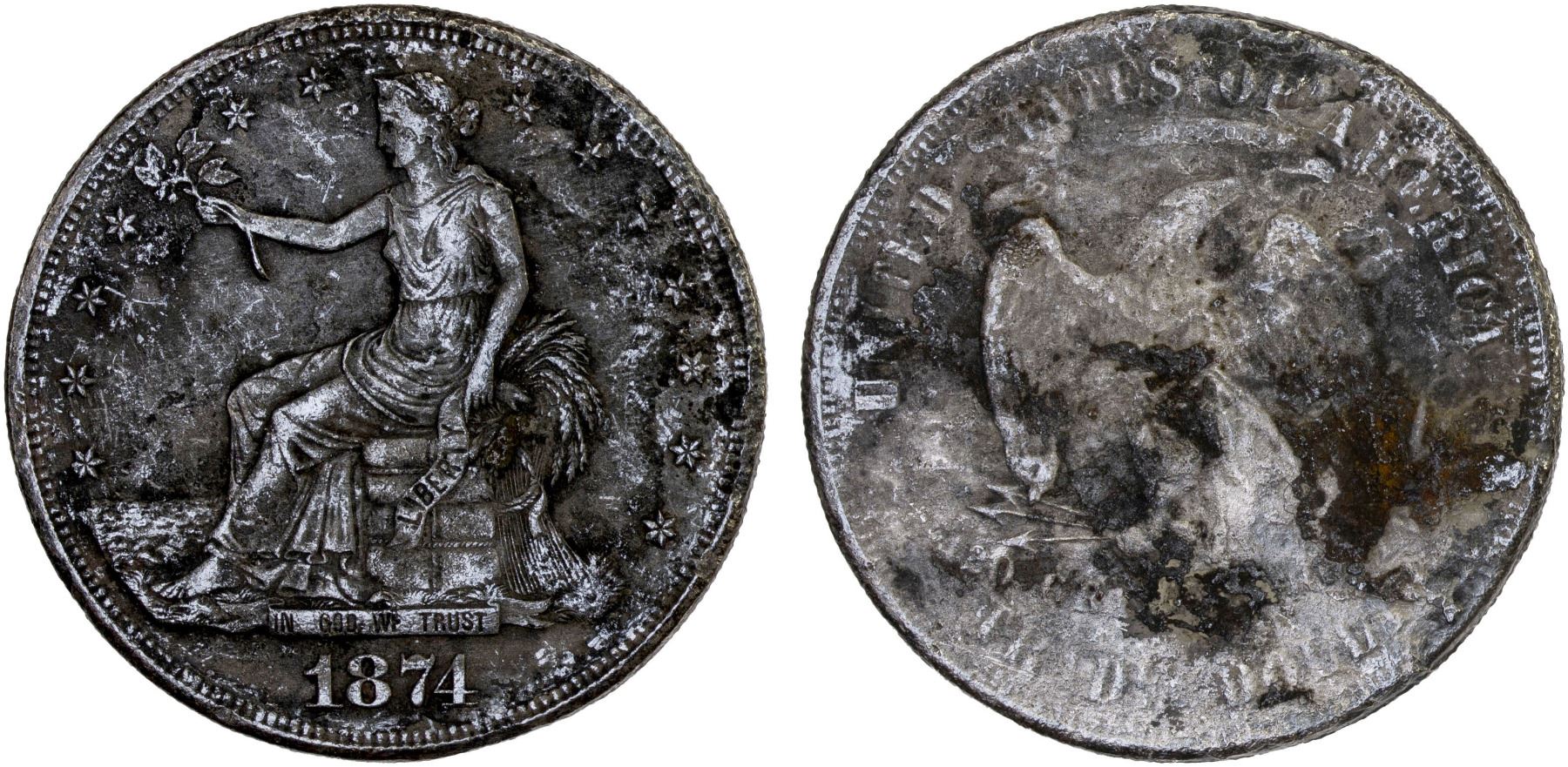 UNITED STATES: AR trade dollar, 1874, KM-108, from the wreck of the Pacific Mail Steamship Company ship SS Japan, salt water damage, Fine. On February 20, 1865, six weeks before his assassination, President Abraham Lincoln approved a bill to establish the Pacific Mail Steam Ship Company as the conduit to formalize trade with China following the completion of the transcontinental "Pacific Railroad." The four ships commissioned for service between San Francisco, Yokohama and Hong Kong were the SS China, SS Great Republic, SS America, and the SS Japan. Constructed between 1866 to 1868, they were the largest, most impressive sidewheel steamships yet built. On November 18, 1874, the SS Japan departed San Francisco on a routine scheduled voyage to Hong Kong, stopping in Yokohama, with 425 Chinese passengers eager to return home after years of labor in California, each person carrying an average of $300 value in gold coin. Also loaded aboard and stowed away in the ship's treasure tank were 168 boxes with $358,508 in newly minted 1874 trade dollar coins. Around midnight on December 17, 1874, fire broke out in the coal bulkhead located amidships, adjacent to the treasure tank. The fire spread quickly from the coal bulkhead, smoke and flames engulfing the wooden center structures of the SS Japan trapping many aboard. Some managed to jump into the dark violent waters. In about 45 minutes the SS Japan was totally engulfed in flames. When the morning of December 18 dawned, the SS Japan was gone with 151 crew and passengers saved in lifeboats and almost 400 Chinese emigrants lost in the fire, on the raging sea and within the sinking hulk of the great ship. The shocking news of the loss of the SS Japan initiated a search and rescue dispatch of two ships of the US Navy's Asiatic fleet from Hong Kong to the wreck site two days later. They found no survivors but recovered a few Chinese bodies among the burnt flotsam in the ship's debris field. In January 1875, Hong Kong underwriters dispatched a schooner and a steamer under the command of Captain Roberts. He searched the area for 6 months, and finally in July located the wreck of the SS Japan in under 128 feet of water. Salvage operations ceased in 1877 after about 300,000 coins were recovered leaving the remaining 58,000 unrecoverable and considered lost. In 2007, the first of a small number of blackened and salt water damaged coins began to enter the market in Hong Kong discovered by fishermen near the wreck site likely doing 'dragnet fishing' or bottom trawling.