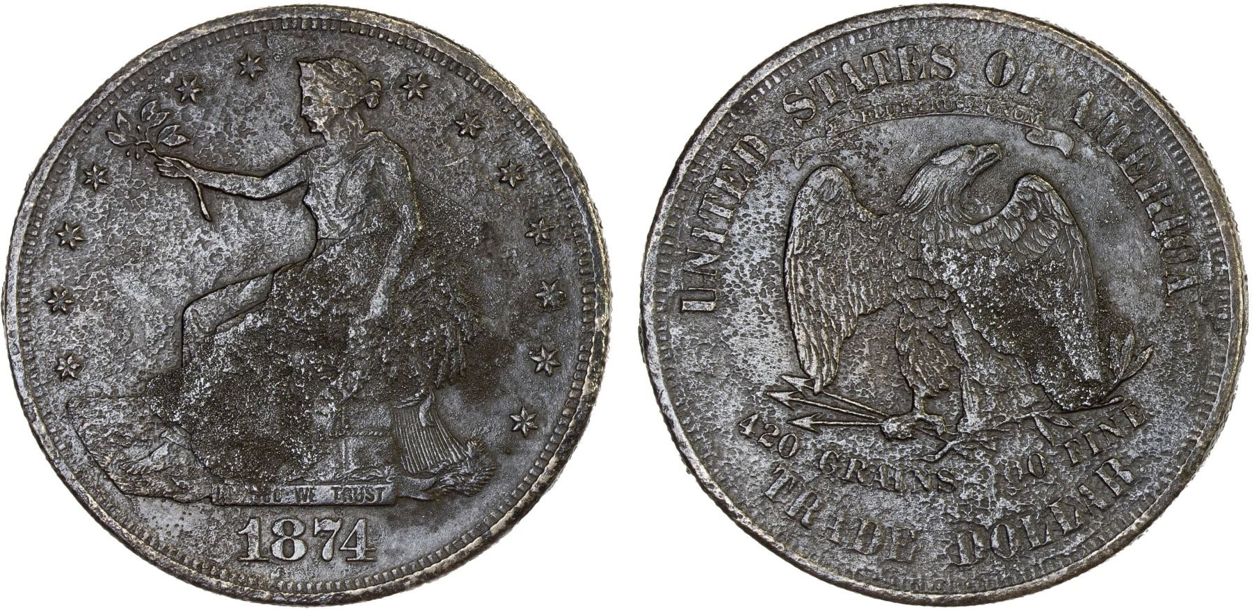 UNITED STATES: AR trade dollar, 1874-S, KM-108, from the wreck of the Pacific Mail Steamship Company ship SS Japan, salt water damage, Good. On February 20, 1865, six weeks before his assassination, President Abraham Lincoln approved a bill to establish the Pacific Mail Steam Ship Company as the conduit to formalize trade with China following the completion of the transcontinental "Pacific Railroad." The four ships commissioned for service between San Francisco, Yokohama and Hong Kong were the SS China, SS Great Republic, SS America, and the SS Japan. Constructed between 1866 to 1868, they were the largest, most impressive sidewheel steamships yet built.On November 18, 1874, the SS Japan departed San Francisco on a routine scheduled voyage to Hong Kong, stopping in Yokohama, with 425 Chinese Passengers eager to return home after years of labor in California, each person carrying an average of $300 value in gold coin. Also loaded aboard and stowed away in the ship's treasure tank were 168 boxes with $358,508 in newly minted 1874 trade dollar coins.Around midnight on December 17, 1874, fire broke out in the coal bulkhead located amidships, adjacent to the treasure tank. The fire spread quickly from the coal bulkhead, smoke and flames engulfing the wooden center structures of the SS Japan trapping many aboard. Some managed to jump into the dark violent waters. In about 45 minutes the SS Japan was totally engulfed in flames. When the morning of December 18 dawned, the SS Japan was gone with 151 crew and passengers saved in lifeboats and almost 400 Chinese emigrants lost in the fire, on the raging sea and within the sinking hulk of the great ship. The shocking news of the loss of the SS Japan initiated a search and rescue dispatch of two ships of the US Navy's Asiatic fleet from Hong Kong to the wreck site two days later. They found no survivors but recovered a few Chinese bodies among the burnt flotsam in the ship's debris field.In January 1875, Hong Kong underwriters dispatched a schooner and a steamer under the command of Captain Roberts. He searched the area for 6 months, and finally in July located the wreck of the SS Japan in under 128 feet of water. Salvage operations ceased in 1877 after about 300,000 coins were recovered leaving the remaining 58,000 unrecoverable and considered lost. In 2007, the first of a small number of blackened and salt water damaged coins began to enter the market in Hong Kong discovered by fishermen near the wreck site likely doing 'dragnet fishing' or bottom trawling.