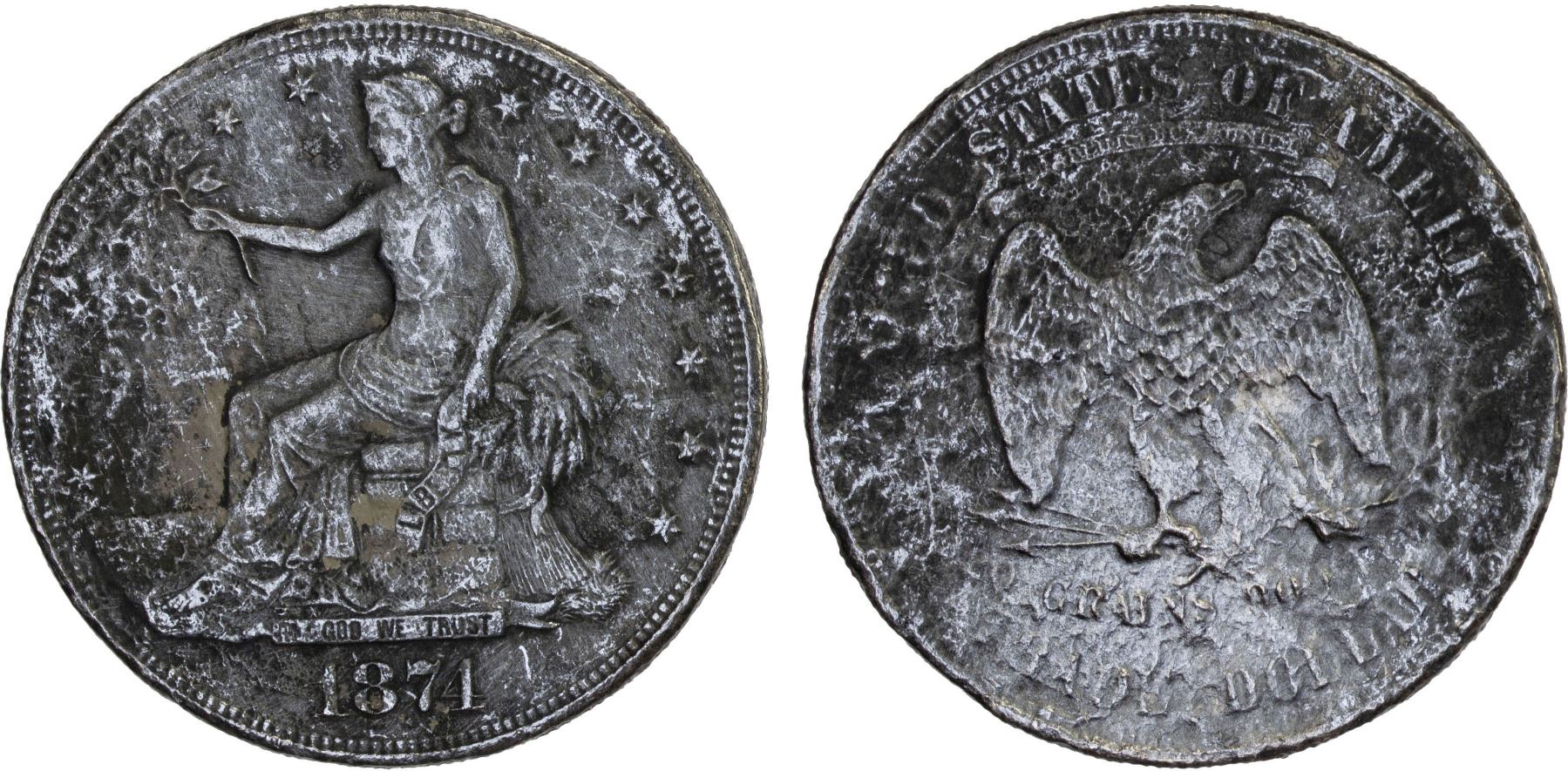 UNITED STATES: AR trade dollar, 1874, KM-108, from the wreck of the Pacific Mail Steamship Company ship SS Japan, salt water damage, VF. On February 20, 1865, six weeks before his assassination, President Abraham Lincoln approved a bill to establish the Pacific Mail Steam Ship Company as the conduit to formalize trade with China following the completion of the transcontinental "Pacific Railroad." The four ships commissioned for service between San Francisco, Yokohama and Hong Kong were the SS China, SS Great Republic, SS America, and the SS Japan. Constructed between 1866 to 1868, they were the largest, most impressive sidewheel steamships yet built. On November 18, 1874, the SS Japan departed San Francisco on a routine scheduled voyage to Hong Kong, stopping in Yokohama, with 425 Chinese passengers eager to return home after years of labor in California, each person carrying an average of $300 value in gold coin. Also loaded aboard and stowed away in the ship's treasure tank were 168 boxes with $358,508 in newly minted 1874 trade dollar coins. Around midnight on December 17, 1874, fire broke out in the coal bulkhead located amidships, adjacent to the treasure tank. The fire spread quickly from the coal bulkhead, smoke and flames engulfing the wooden center structures of the SS Japan trapping many aboard. Some managed to jump into the dark violent waters. In about 45 minutes the SS Japan was totally engulfed in flames. When the morning of December 18 dawned, the SS Japan was gone with 151 crew and passengers saved in lifeboats and almost 400 Chinese emigrants lost in the fire, on the raging sea and within the sinking hulk of the great ship. The shocking news of the loss of the SS Japan initiated a search and rescue dispatch of two ships of the US Navy's Asiatic fleet from Hong Kong to the wreck site two days later. They found no survivors but recovered a few Chinese bodies among the burnt flotsam in the ship's debris field. In January 1875, Hong Kong underwriters dispatched a schooner and a steamer under the command of Captain Roberts. He searched the area for 6 months, and finally in July located the wreck of the SS Japan in under 128 feet of water. Salvage operations ceased in 1877 after about 300,000 coins were recovered leaving the remaining 58,000 unrecoverable and considered lost. In 2007, the first of a small number of blackened and salt water damaged coins began to enter the market in Hong Kong discovered by fishermen near the wreck site likely doing 'dragnet fishing' or bottom trawling.