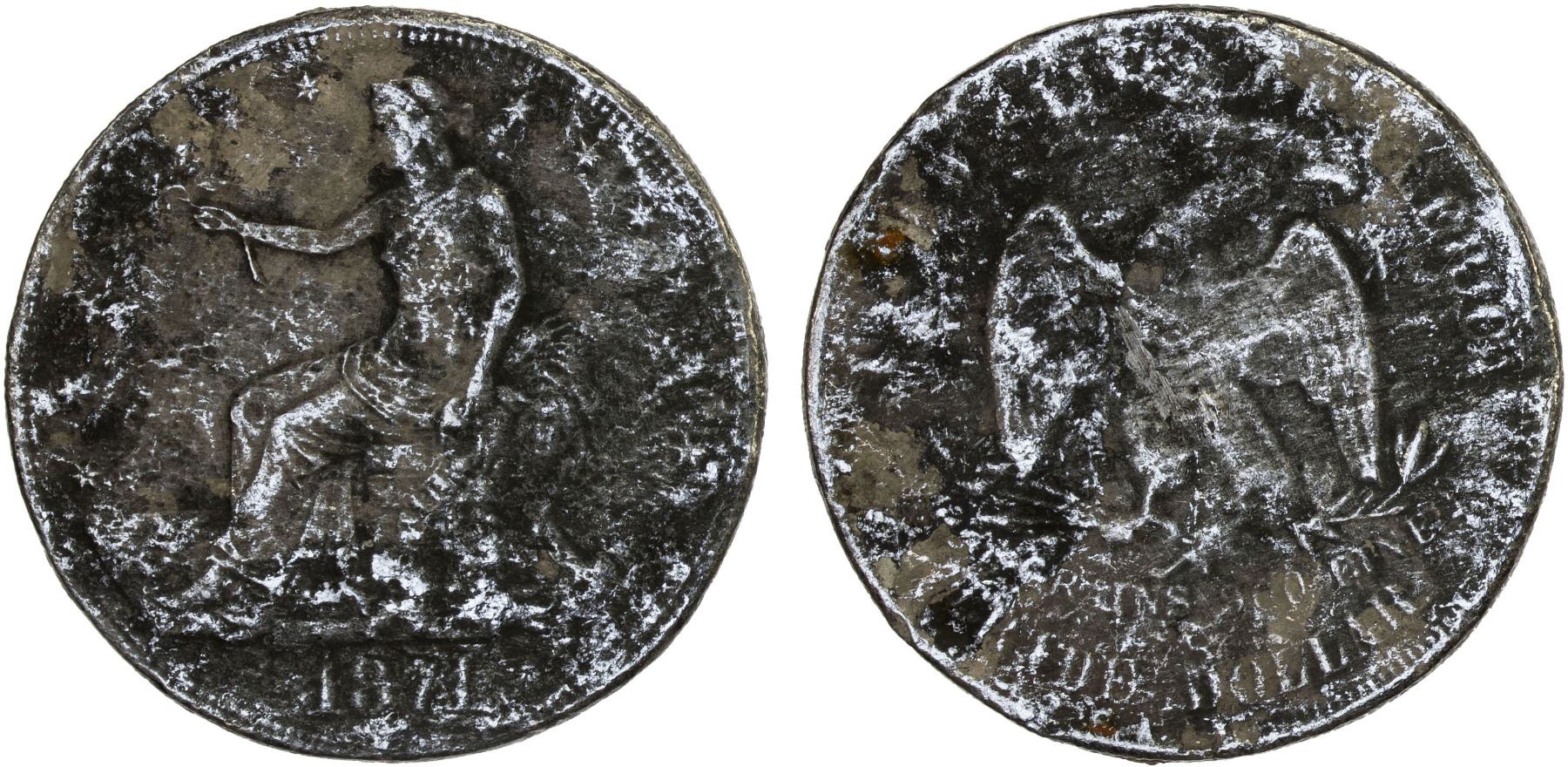 UNITED STATES: AR trade dollar, 1874, KM-108, from the wreck of the Pacific Mail Steamship Company ship SS Japan, salt water damage, VG. On February 20, 1865, six weeks before his assassination, President Abraham Lincoln approved a bill to establish the Pacific Mail Steam Ship Company as the conduit to formalize trade with China following the completion of the transcontinental "Pacific Railroad." The four ships commissioned for service between San Francisco, Yokohama and Hong Kong were the SS China, SS Great Republic, SS America, and the SS Japan. Constructed between 1866 to 1868, they were the largest, most impressive sidewheel steamships yet built. On November 18, 1874, the SS Japan departed San Francisco on a routine scheduled voyage to Hong Kong, stopping in Yokohama, with 425 Chinese passengers eager to return home after years of labor in California, each person carrying an average of $300 value in gold coin. Also loaded aboard and stowed away in the ship's treasure tank were 168 boxes with $358,508 in newly minted 1874 trade dollar coins. Around midnight on December 17, 1874, fire broke out in the coal bulkhead located amidships, adjacent to the treasure tank. The fire spread quickly from the coal bulkhead, smoke and flames engulfing the wooden center structures of the SS Japan trapping many aboard. Some managed to jump into the dark violent waters. In about 45 minutes the SS Japan was totally engulfed in flames. When the morning of December 18 dawned, the SS Japan was gone with 151 crew and passengers saved in lifeboats and almost 400 Chinese emigrants lost in the fire, on the raging sea and within the sinking hulk of the great ship. The shocking news of the loss of the SS Japan initiated a search and rescue dispatch of two ships of the US Navy's Asiatic fleet from Hong Kong to the wreck site two days later. They found no survivors but recovered a few Chinese bodies among the burnt flotsam in the ship's debris field. In January 1875, Hong Kong underwriters dispatched a schooner and a steamer under the command of Captain Roberts. He searched the area for 6 months, and finally in July located the wreck of the SS Japan in under 128 feet of water. Salvage operations ceased in 1877 after about 300,000 coins were recovered leaving the remaining 58,000 unrecoverable and considered lost. In 2007, the first of a small number of blackened and salt water damaged coins began to enter the market in Hong Kong discovered by fishermen near the wreck site likely doing 'dragnet fishing' or bottom trawling.