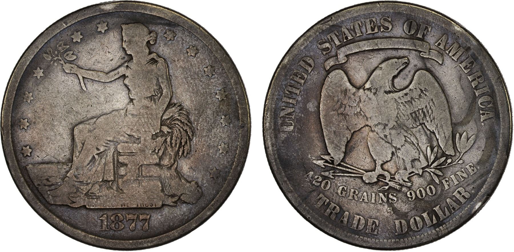 UNITED STATES: AR trade dollar, 1877-S, KM-108, Liberty Seated type, an unusually low quality for this type, likely a 'pocket' or worry' coin, VG. A heavily worn pocket piece coin is a personal token, often smooth and lacking detail from years of handling and general pocket wear, making it monetarily less valuable but sentimentally priceless; classic examples include worn silver dollars or commemoratives, chosen for their personal meaning rather than numismatic condition.