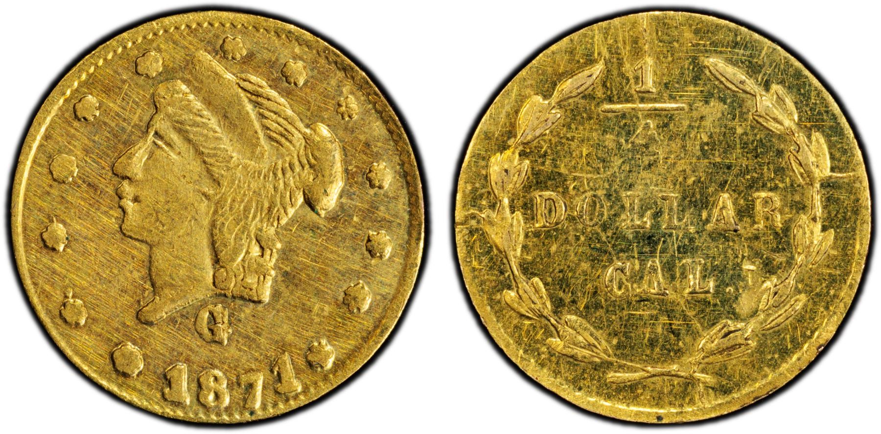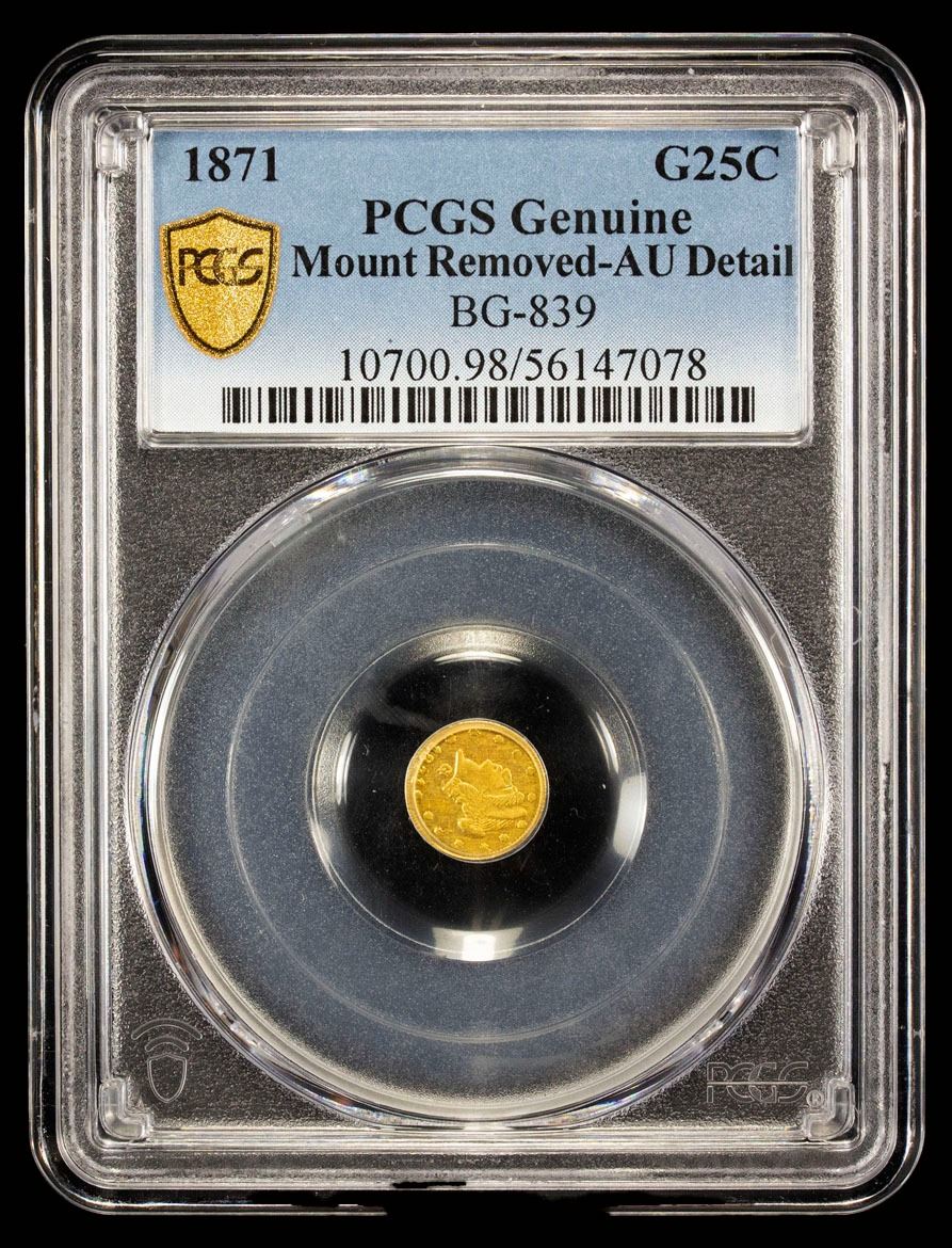 UNITED STATES: AV 1/4 dollar (0.29g), 1871, BG-839, California Fractional Gold, mount removed, PCGS graded AU details, ex Coin Galleries Auction November 10, 1992, Lot 4454, with original auction tag.