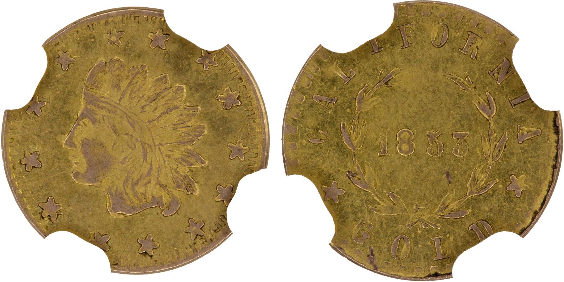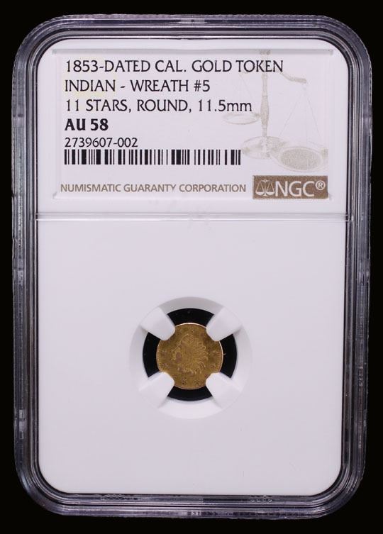 UNITED STATES: AV 1/4 dollar, 1853, 11.5mm, California Gold token round, Indian type, 11 Stars, wreath 5, dated 1853, NGC graded AU55.