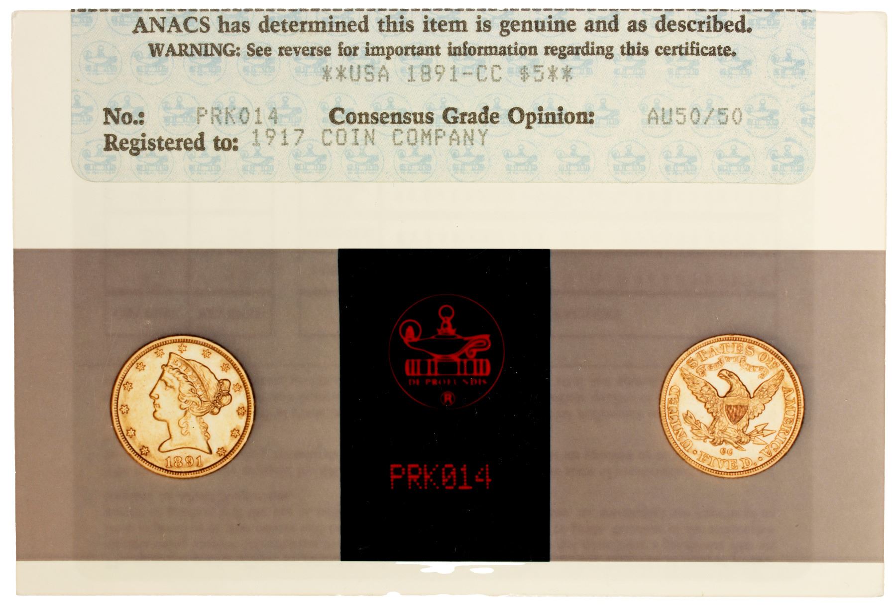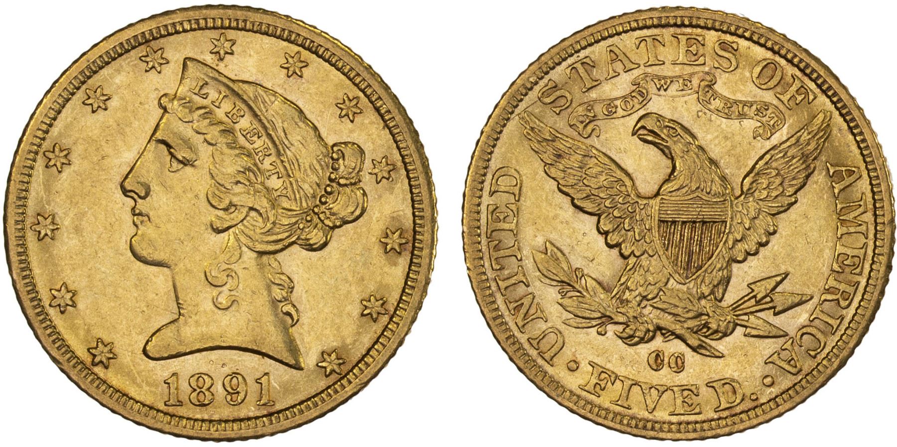 UNITED STATES: AV 5 dollar, 1891-CC, KM-101, Liberty Head with motto type, ANACS graded AU50. With old American Numismatic Association Certification Service (ANACS) photo certificate.