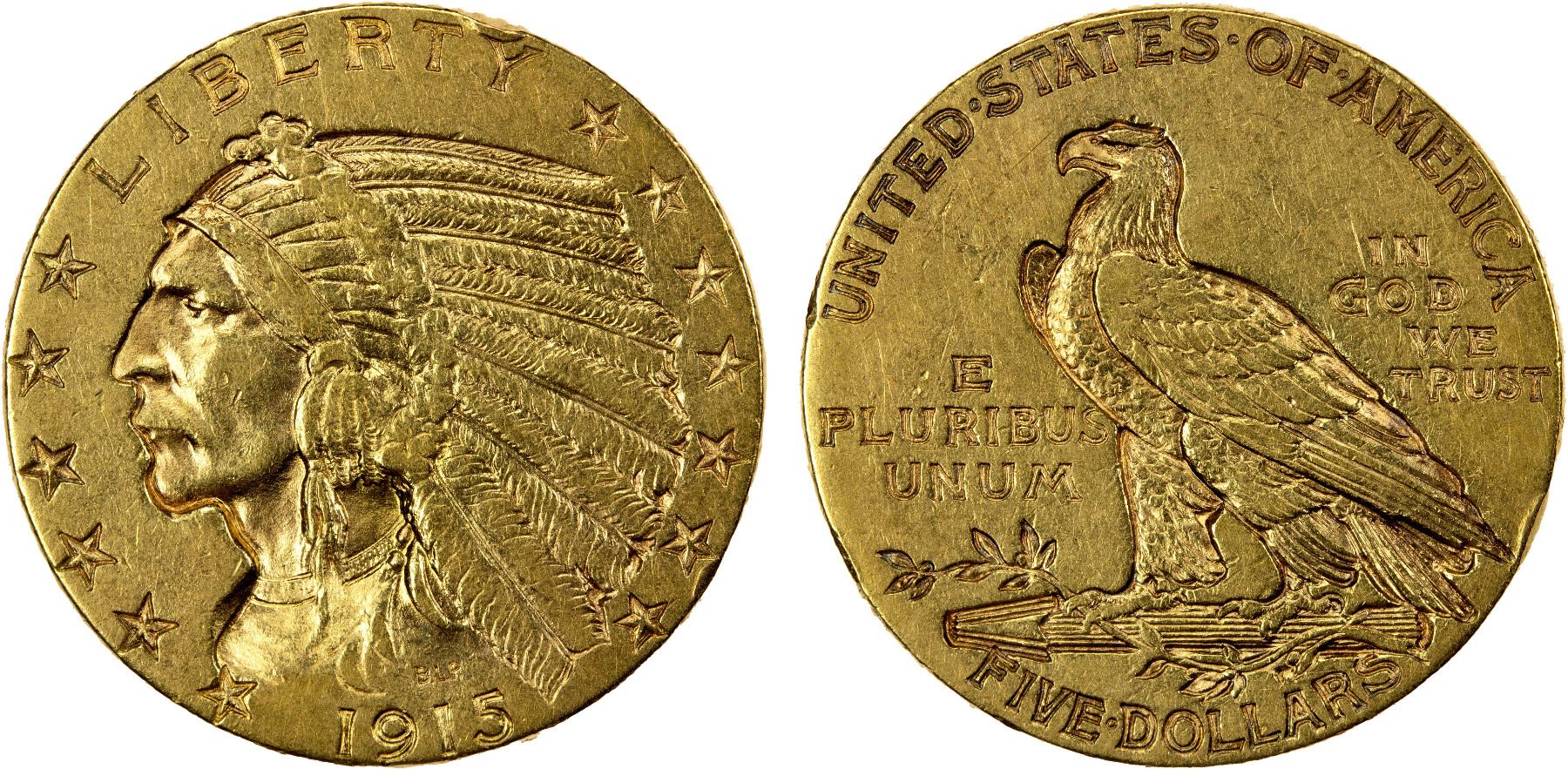 UNITED STATES: AV 5 dollars, 1915, KM-129, Indian Head type, a few tiny rim taps, EF.
