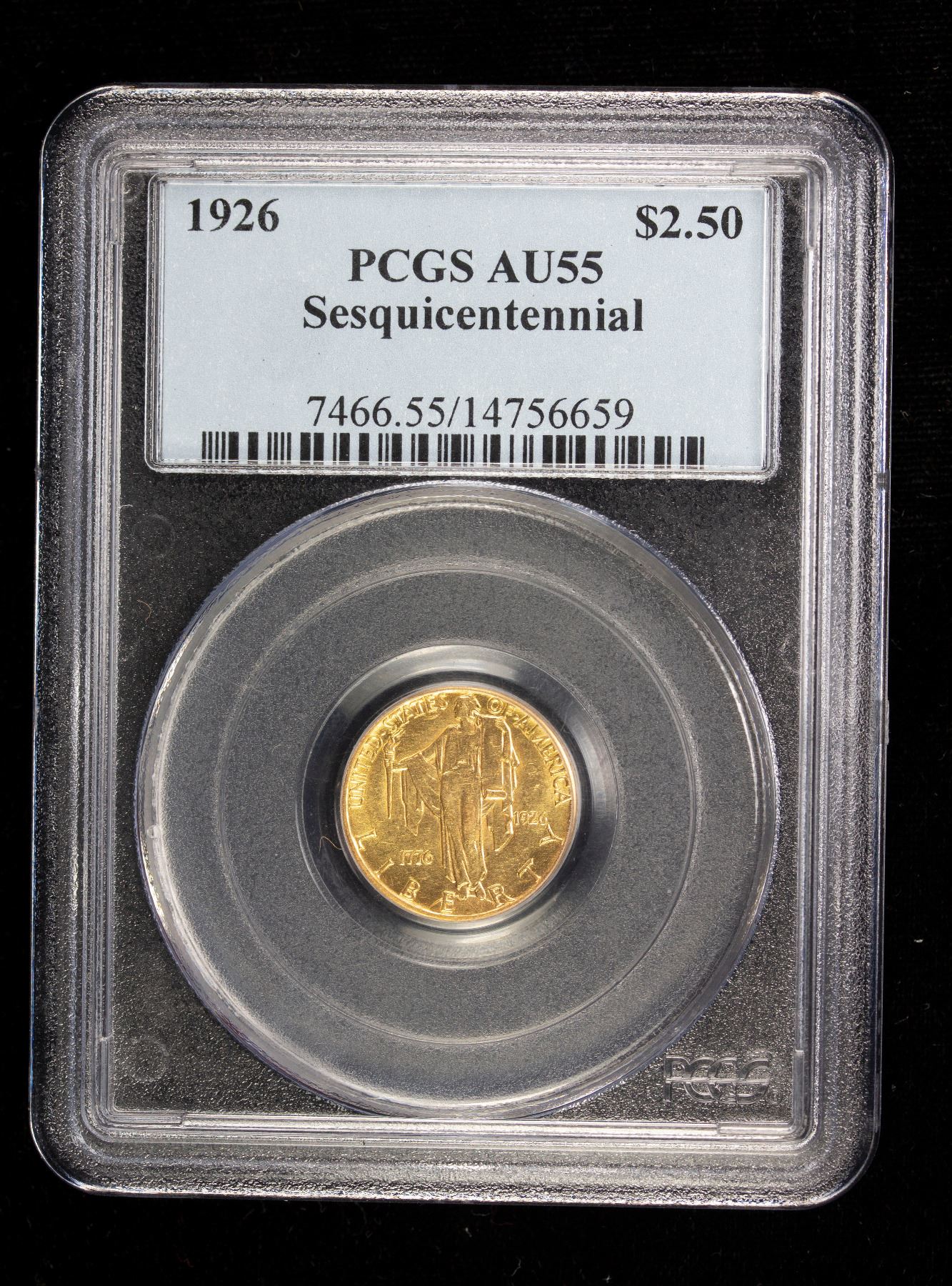 UNITED STATES: AV Sesquicentennial 2½ dollars, 1926, KM-161, PCGS graded AU55. The issue was sold to support the National Sesquicentennial Exhibition in Philadelphia, which was formed to celebrate the 150th Anniversary of the signing of the Declaration of Independence.