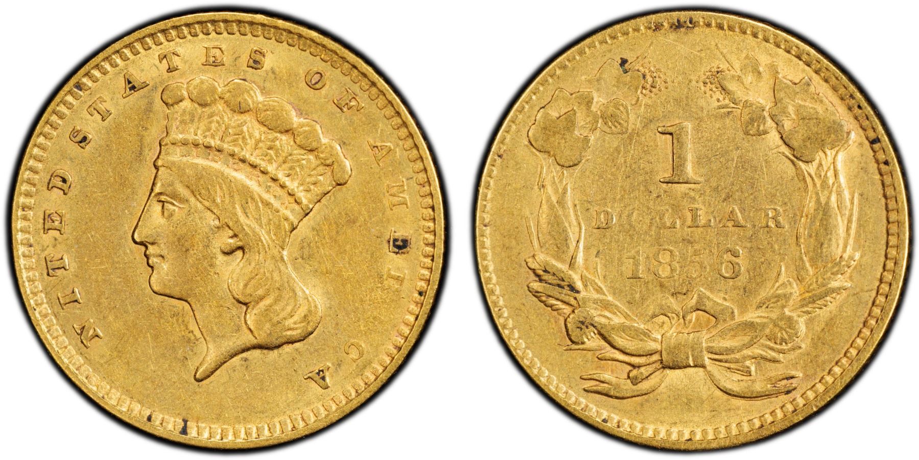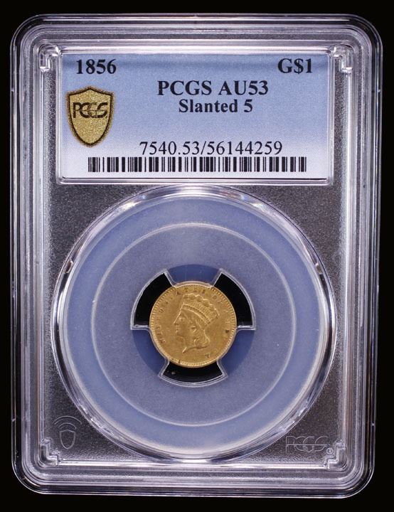 UNITED STATES: AV dollar, 1856, KM-86, Indian Head, Type 3, slanted 5 variety, PCGS graded AU53.