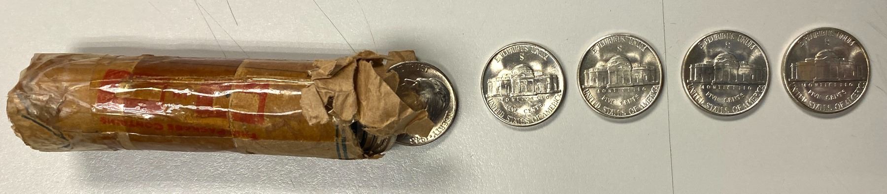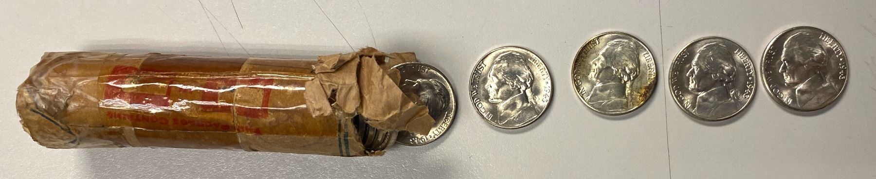 UNITED STATES: BI 5 cents roll, 1943-S, KM-192a, coins in old paper coin wrapper, beautifully preserved, roll of 40 pieces, Choice Unc.