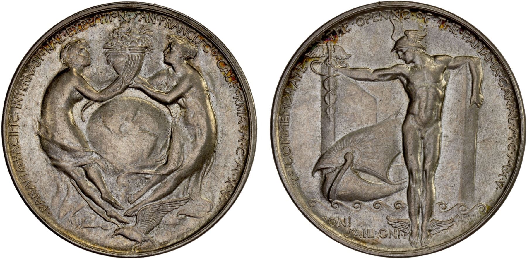 UNITED STATES: CALIFORNIA: AR medal (30.00g), 1915, Shevler-Hyder-18.1, HK-399, silver medal by R.I. Aitken for the Medallic Art Co. and struck in the Expo grounds: two robed female figures representing North and South America supporting cornucopias above a globe centered on Panama // standing figure of Mercury, nude, holding caduceus and opening lock-gates for a Viking longboat, Unc. Issued at the Expo to celebrate the completion and operning of the Panama Canal.