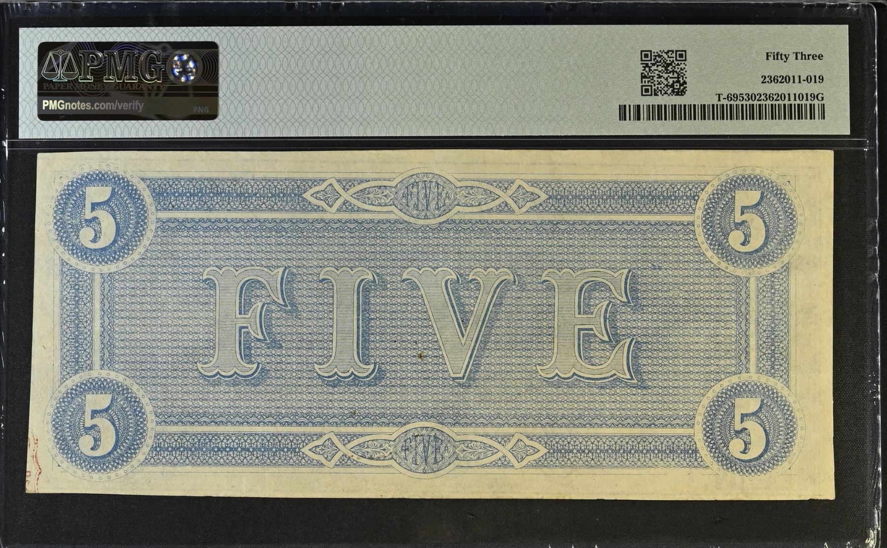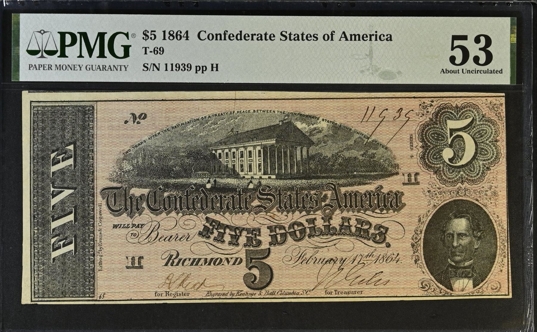 UNITED STATES CIVIL WAR: CONFEDERACY: 5 dollars, 17.2.1864, Pick-67, Fr-CS-69, T-69, C. G. Memminger portrait, Series 4, good eye appeal, PMG graded AU53, ex Dr. Robert A. Rosenfeld Collection.