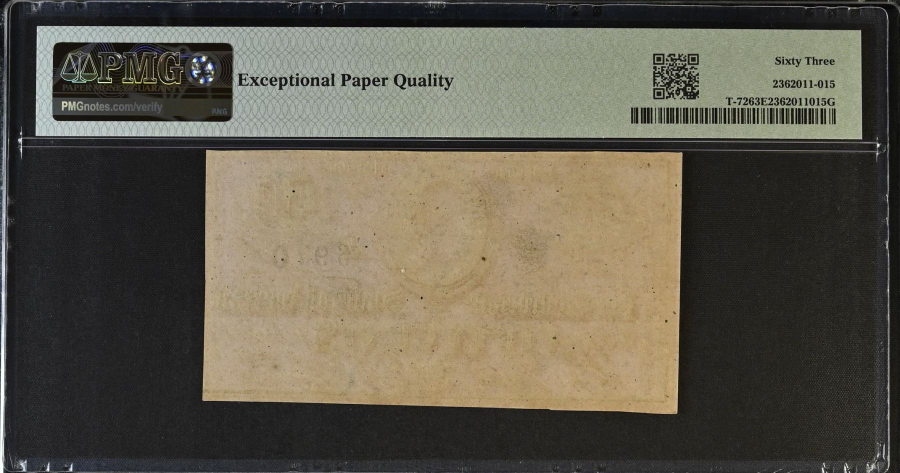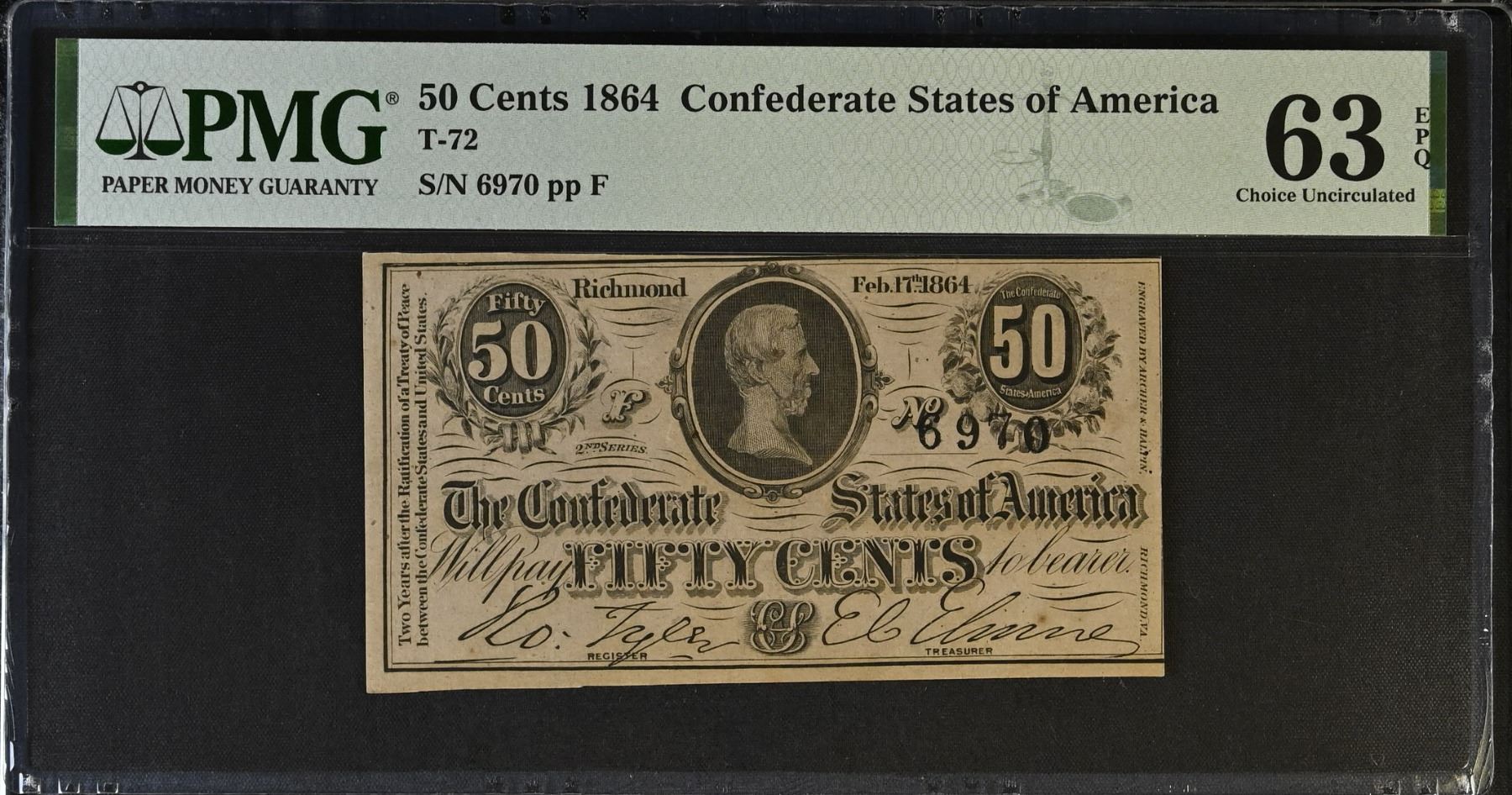 UNITED STATES CIVIL WAR: CONFEDERACY: 50 cents, 17.2.1864, Pick-64b, Fr-CS-72, T-72, Jefferson Davis portrait, Tyler and Elinore signatures, very attractive, PMG graded MS63 EPQ, ex Dr. Robert A. Rosenfeld Collection.