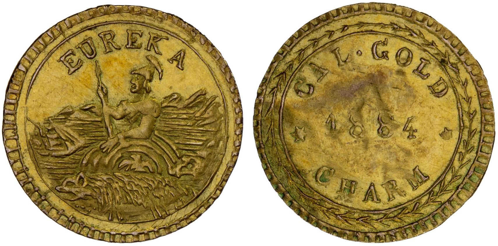 UNITED STATES: California, charm (0.11g), 1884, Locke-Unlisted, 10mm round gilt brass or gold charm, crude seal of the State of California with EUREKA at top // CAL. GOLD / 1884 / CHARM within stylized wreath and with denticle border, semi-prooflike, some hairlines, somewhat wavy flan, Choice AU.